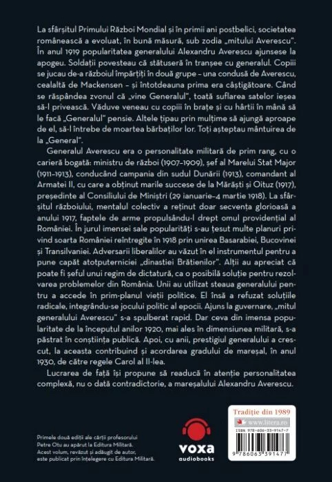 Lucrarea de faţă îşi propune să readucă în atenţie personalitatea complexă, nu o dată contradictorie, a mareşalului Alexandru Averescu.