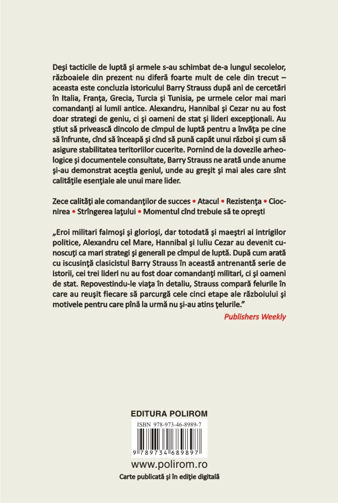 Deşi tacticile de luptă şi armele s-au schimbat de-a lungul secolelor, războaiele din prezent nu diferă foarte mult de cele din trecut – aceasta este concluzia istoricului Barry Strauss după ani de cercetări în Italia, Franţa, Grecia, Turcia şi Tunisia, pe urmele celor mai mari comandanţi ai lumii antice. Alexandru, Hannibal şi Cezar nu au fost doar strategi de geniu, ci şi oameni de stat şi lideri excepţionali. Au ştiut să privească dincolo de câmpul de luptă pentru a învăţa pe cine să înfrunte, când să înceapă şi când să pună capăt unui război şi cum să asigure stabilitatea teritoriilor cucerite. Pornind de la dovezile arheologice şi documentele consultate, Barry Strauss ne arată unde anume şi-au demonstrat aceştia geniul, unde au greşit şi mai ales care sunt calităţile esenţiale ale unui mare lider.