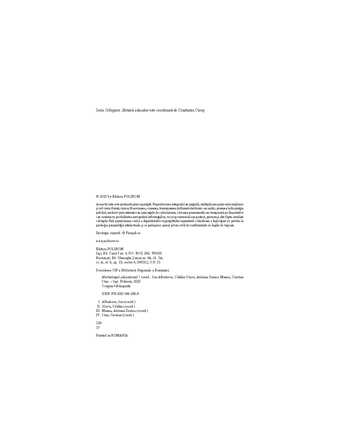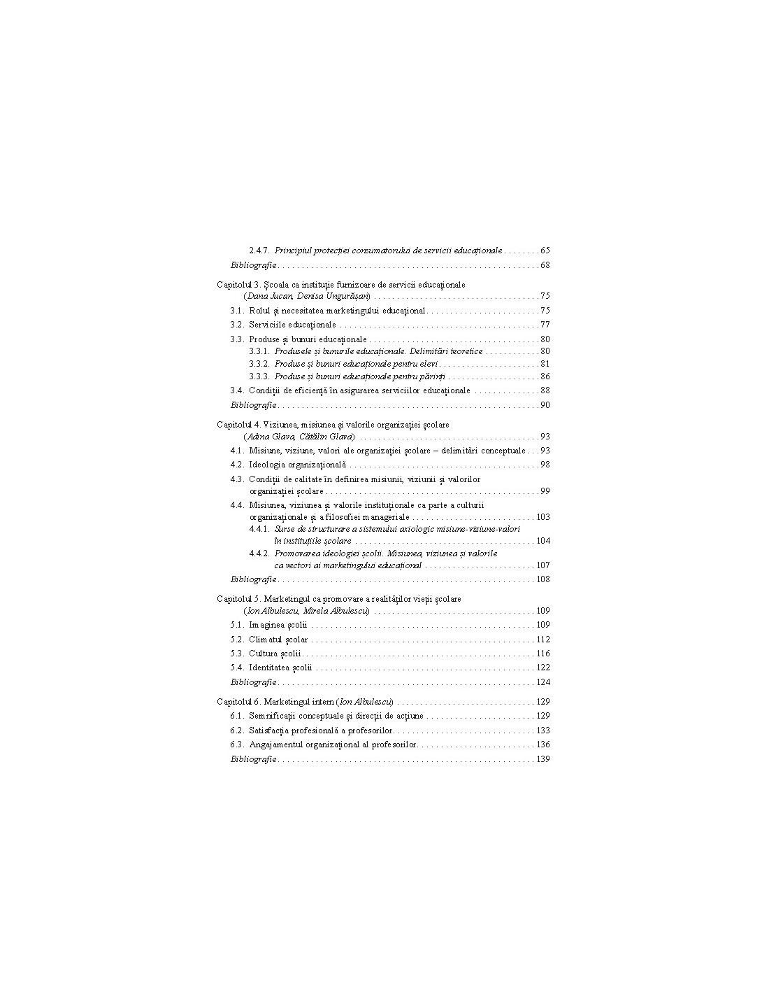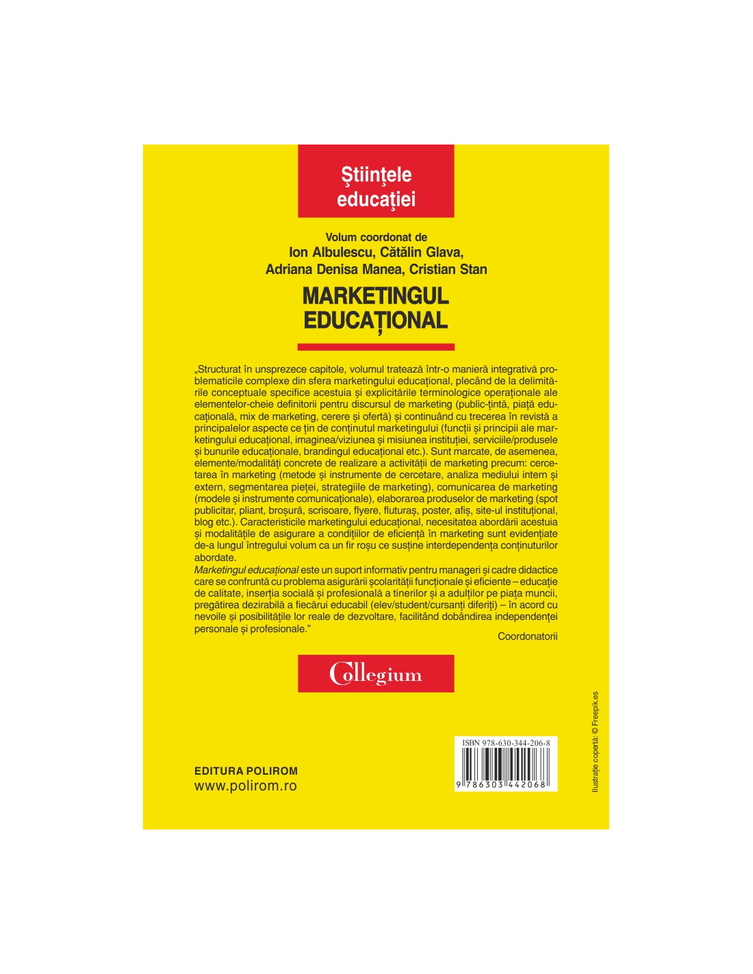 Caracteristicile marketingului educațional, necesitatea abordării acestuia și modalitățile de asigurare a condițiilor de eficiență în marketing sunt evidențiate de-a lungul întregului volum ca un fir roșu ce susține interdependența conținuturilor abordate.