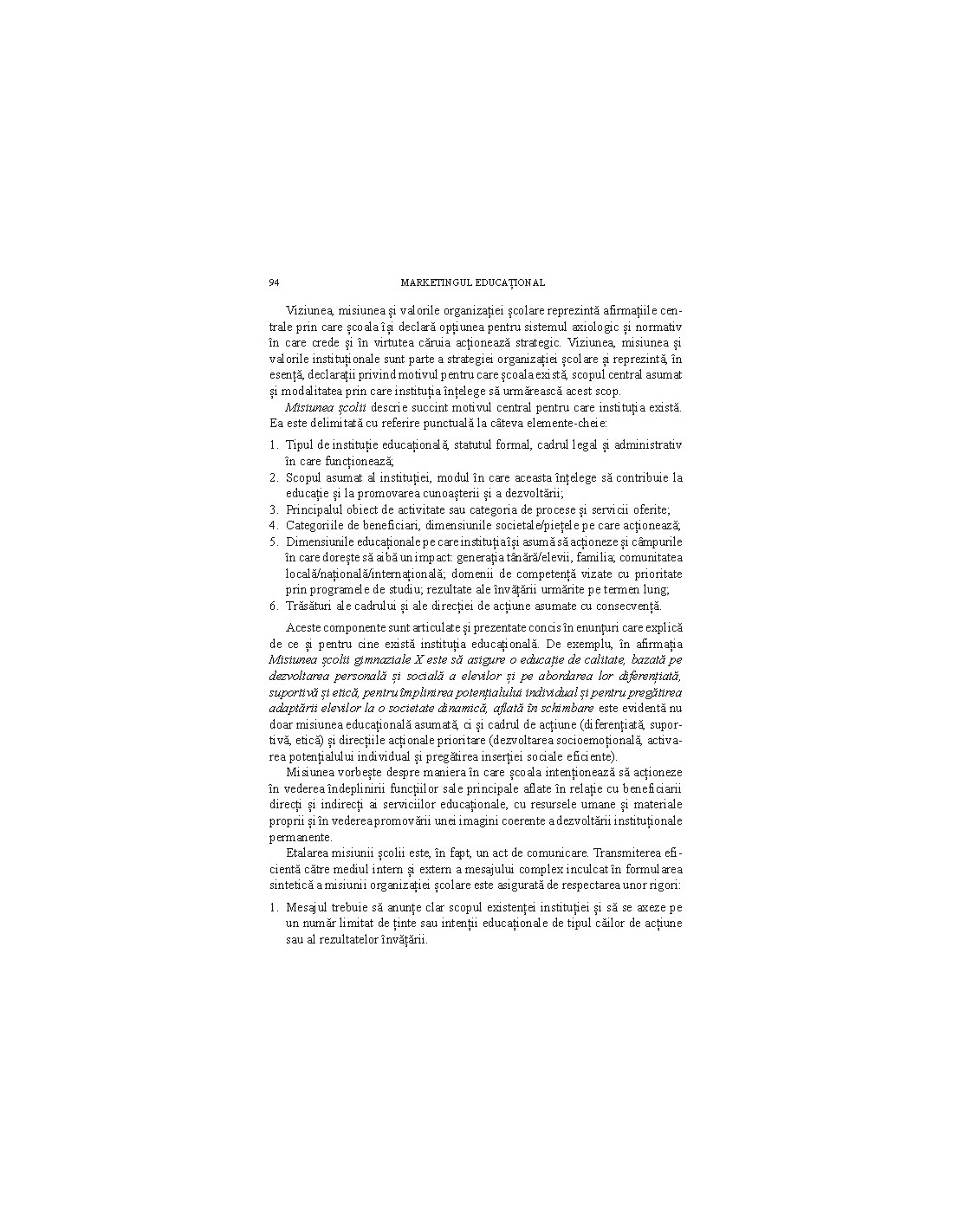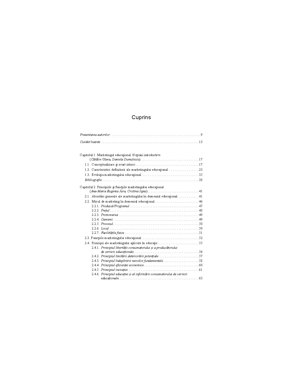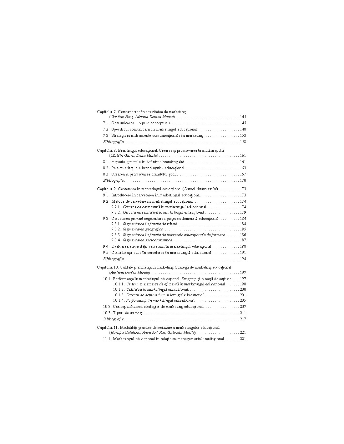 „Structurat în unsprezece capitole, volumul tratează într-o manieră integrativă problematicile complexe din sfera marketingului educațional, plecând de la delimitările conceptuale specifice acestuia și explicitările terminologice operaționale ale elementelor-cheie definitorii pentru discursul de marketing (public-țintă, piață educațională, mix de marketing, cerere și ofertă) și continuând cu trecerea în revistă a principalelor aspecte ce țin de conținutul marketingului (funcții și principii ale marketingului educațional, imaginea/viziunea și misiunea instituției, serviciile/produsele și bunurile educaționale, brandingul educațional etc.).