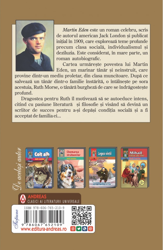 Martin Eden este un roman celebru, scris de autorul american Jack London si publicat initial in 1909, care exploreaza teme profunde precum clasa sociala, individualismul si deziluzia. Este considerat, in mare parte, un roman autobiografic.