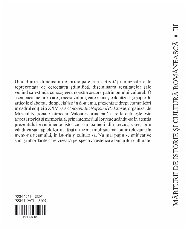 Cercetarea științifică reprezintă una dintre dimensiunile principale ale activității muzeale, diseminarea rezultatelor sale venind să extindă cunoașterea noastră asupra patrimoniului cultural. O asemenea menire o are și acest volum, care reunește douăzeci și șapte de articole elaborate de specialiști în domeniu, prezentate drept comunicări în cadrul ediției a XXVI-a a Colocviului Național de Istorie, organizat de Muzeul Național Cotroceni.
