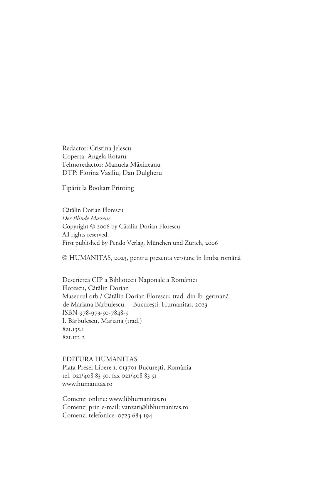 Născut la Timișoara în 1967, CĂTĂLIN DORIAN FLORESCU trăiește în Elveția din 1982. A urmat studii de psihologie și psihopatologie la Zürich, specializându-se în terapia umanistă Gestalt. După absolvire a lucrat ca psiholog într-un centru de reabilitare pentru dependenții de droguri. Din 2001 este scriitor liber-profesionist. A publicat romanele Wunderzeit (Vremea minunilor, 2001; Humanitas, 2022), Der kurze Weg nach Hause (Scurtul drum spre casă, 2002), Der blinde Masseur (Maseurul orb, 2006), Zaira (2008), Jacob beschließt zu lieben (Jacob se hotărăște să iubească, 2011; în curs de apariție la Humanitas), Der Mann, der das Glück Bringt (Bărbatul care aduce fericirea, Humanitas, 2016), Der Feuerturm (Turnul de foc, 2022) și volumul de povestiri Der Nabel der Welt (În buricul pământului, Humanitas, 2019). Cărțile sale au fost traduse în peste zece limbi.