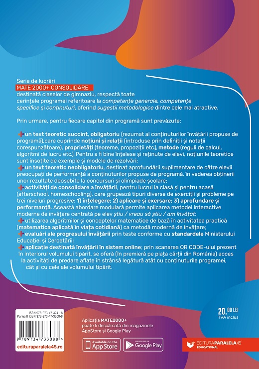 Seria de lucrări MATE 2000+ CONSOLIDARE, destinată claselor de gimnaziu, respectă toate cerințele programei referitoare la competențe generale, competențe specifice și conținuturi, oferind sugestii metodologice dintre cele mai atractive.