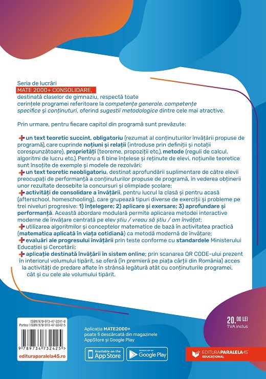 Seria de lucrări MATE 2000+ CONSOLIDARE, destinată claselor de gimnaziu, respectă toate cerințele programei referitoare la competențe generale, competențe specifice și conținuturi, oferind sugestii metodologice dintre cele mai atractive.