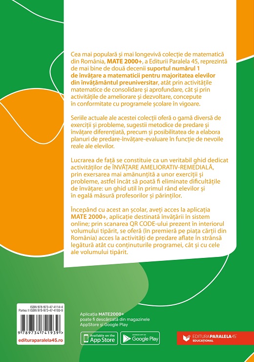 Cea mai populară şi mai longevivă colecţie de matematică din România, MATE 2000+, a Editurii Paralela 45, reprezintă de mai bine de două decenii suportul numărul 1 de învăţare a matematicii pentru majoritatea elevilor din învăţământul preuniversitar, atât prin activităţile matematice de consolidare şi aprofundare, cât şi prin activităţile de ameliorare şi dezvoltare, concepute în conformitate cu programele şcolare în vigoare.