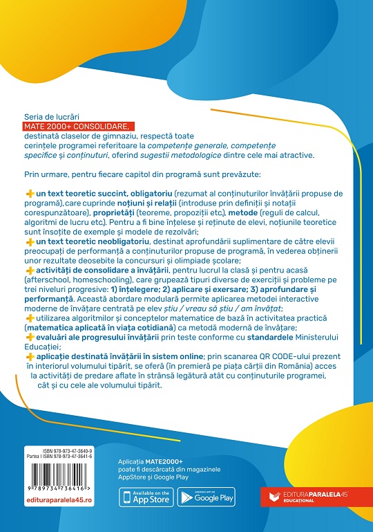 Seria de lucrări MATE 2000+ CONSOLIDARE, destinată claselor de gimnaziu, respectă toate cerințele programei referitoare la competențe generale, competențe specifice și conținuturi, oferind sugestii metodologice dintre cele mai atractive.