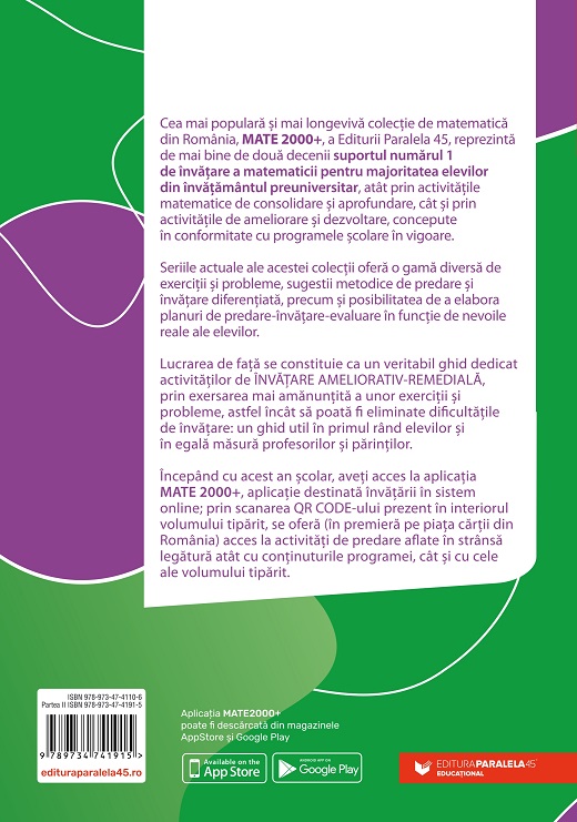 Cea mai populară şi mai longevivă colecţie de matematică din România, MATE 2000+, a Editurii Paralela 45, reprezintă de mai bine de două decenii suportul numărul 1 de învăţare a matematicii pentru majoritatea elevilor din învăţământul preuniversitar, atât prin activităţile matematice de consolidare şi aprofundare, cât şi prin activităţile de ameliorare şi dezvoltare, concepute în conformitate cu programele şcolare în vigoare.