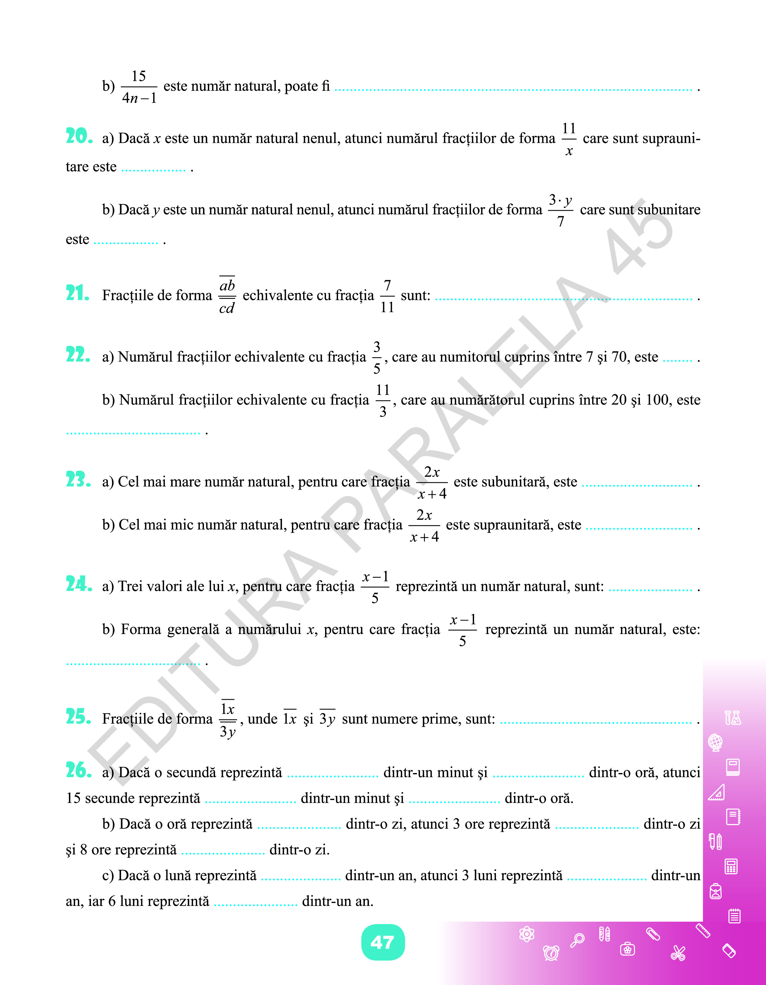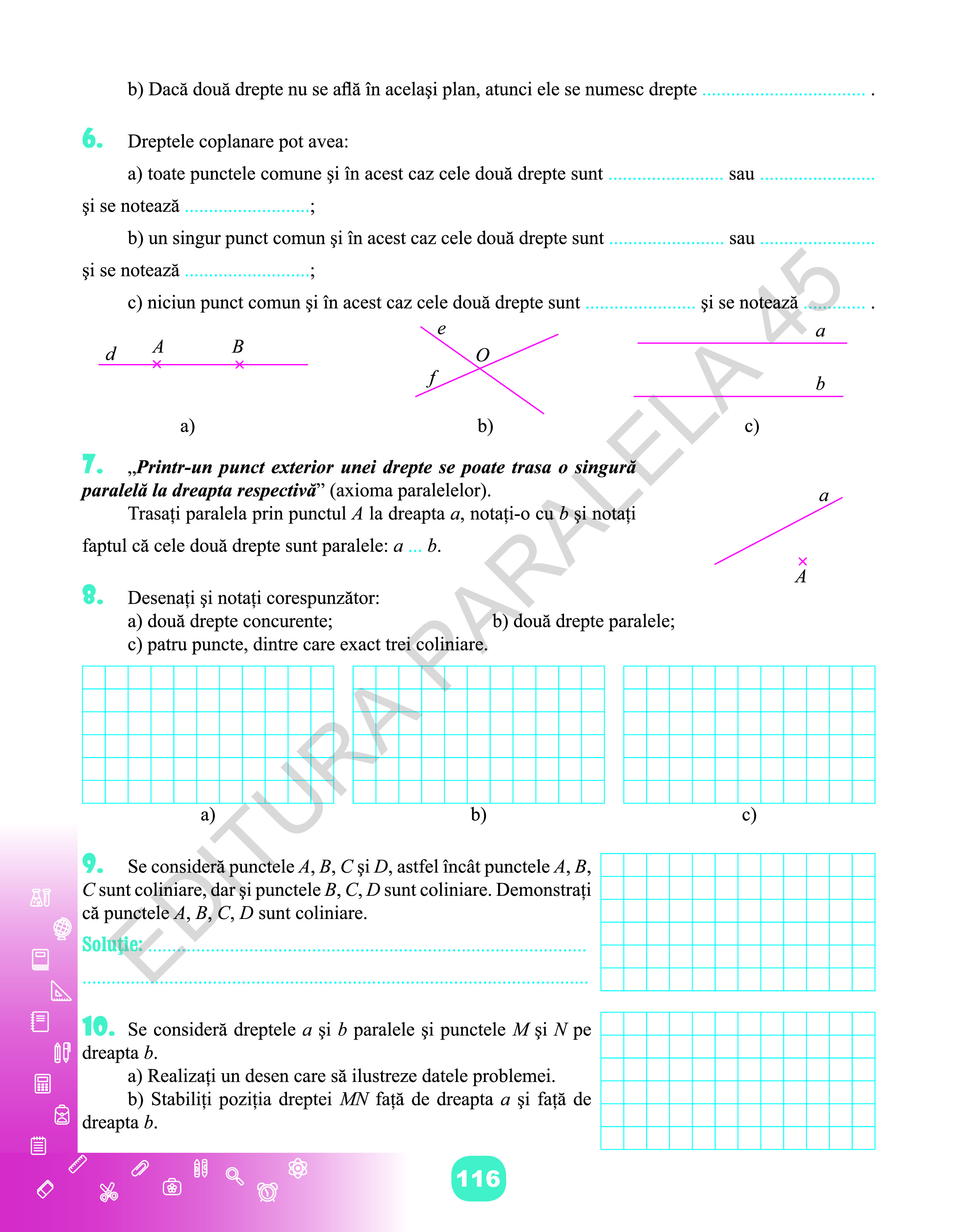 Culegerea poate fi folosită cu succes și de către profesor în activitatea de proiectare, organizare și desfășurare a lecțiilor matematice de o înaltă calitate.