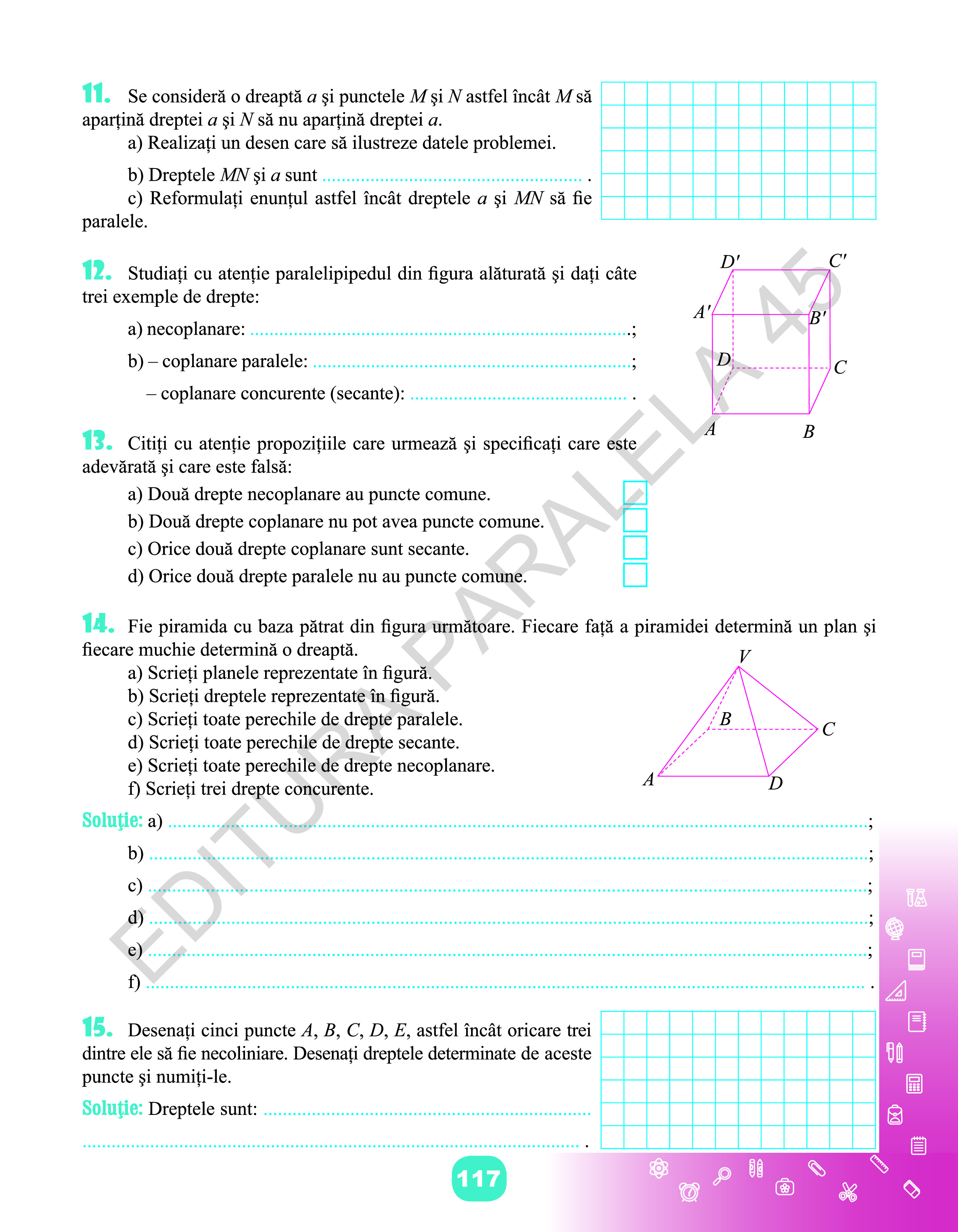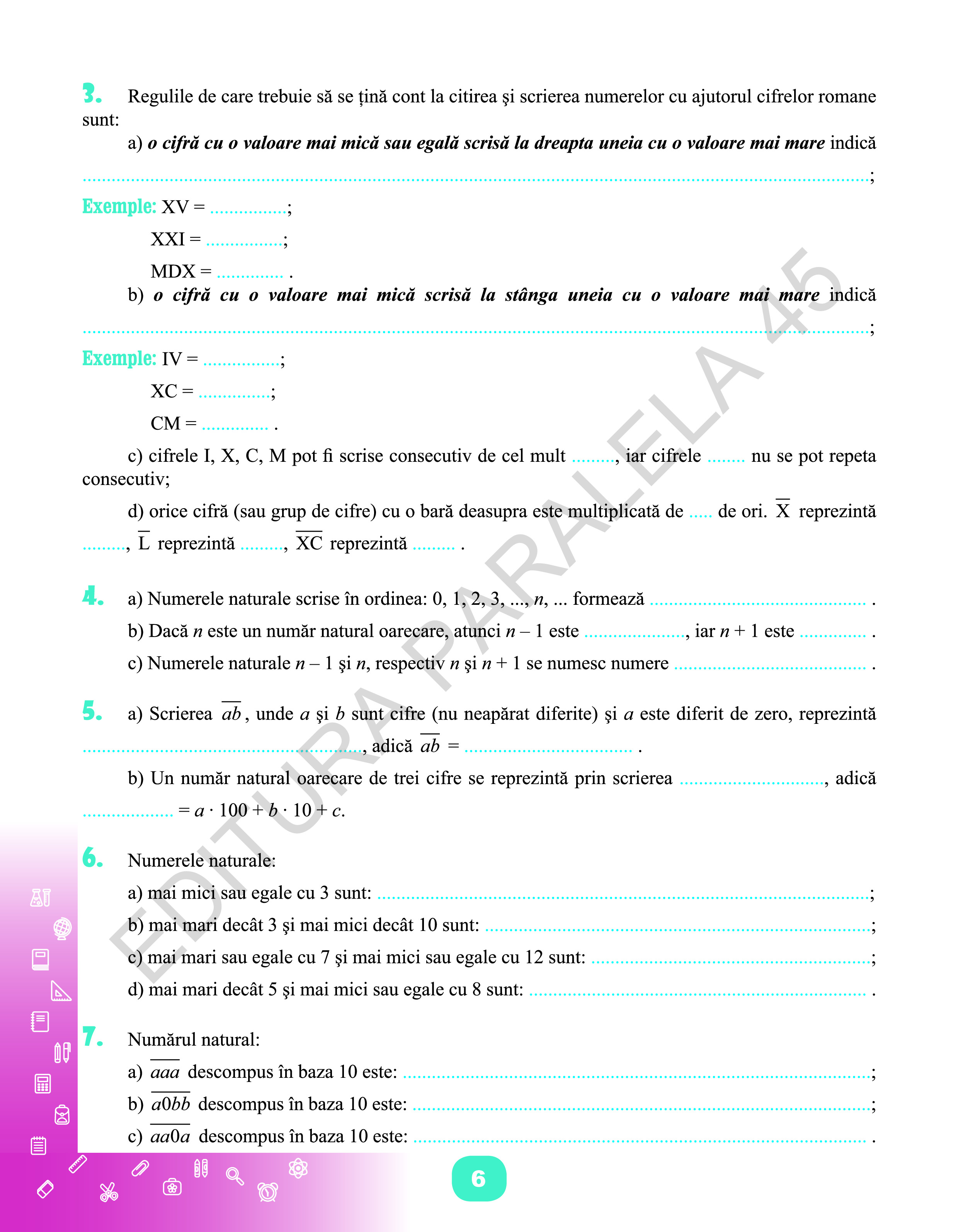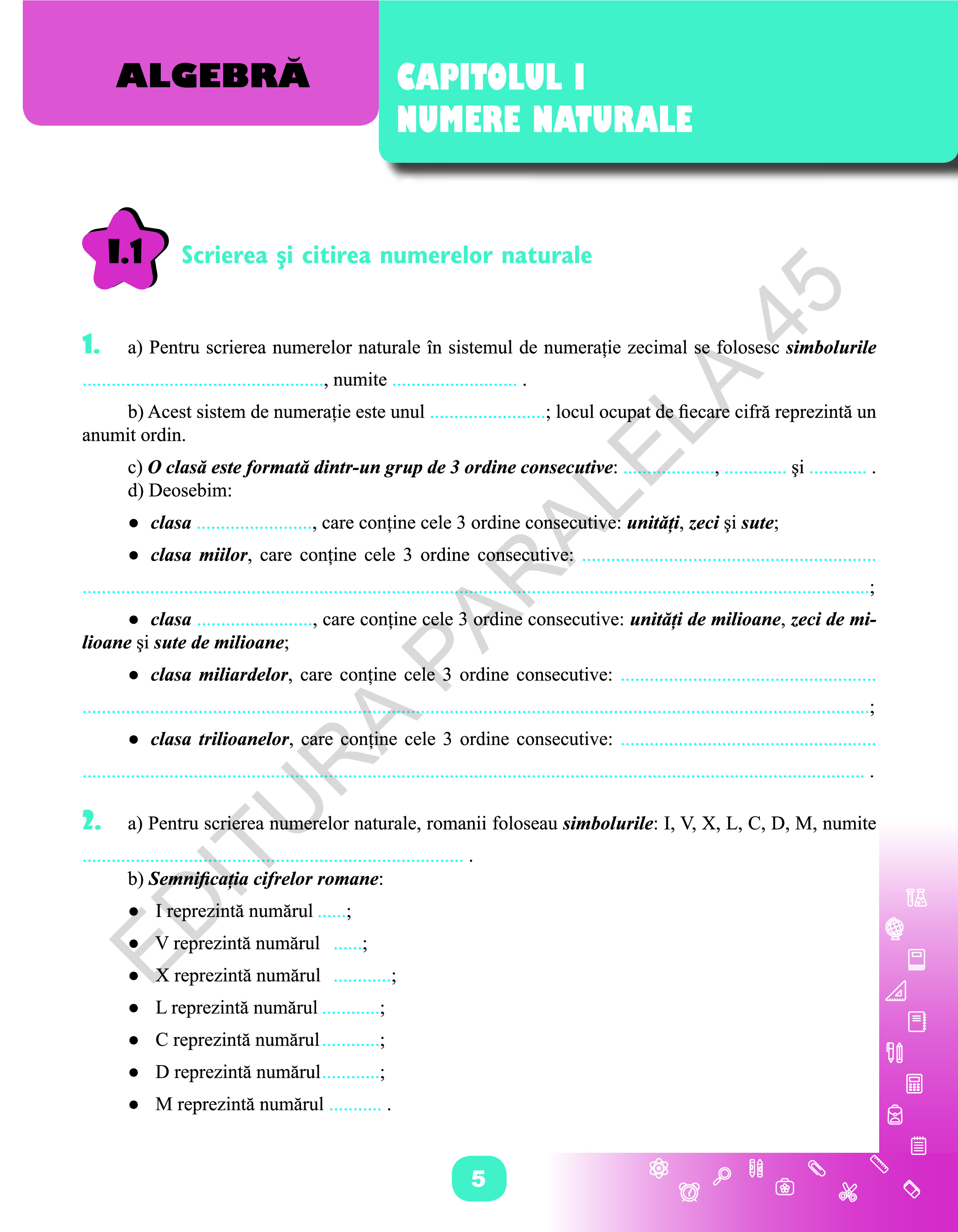 - activitățile de învățare (exercițiile și problemele) propuse sunt și ele minimale și alese cu multă grijă, unele cu conținut inter- și transdisciplinar, cu parcurgere ușoară, stimulativă și provocatoare.