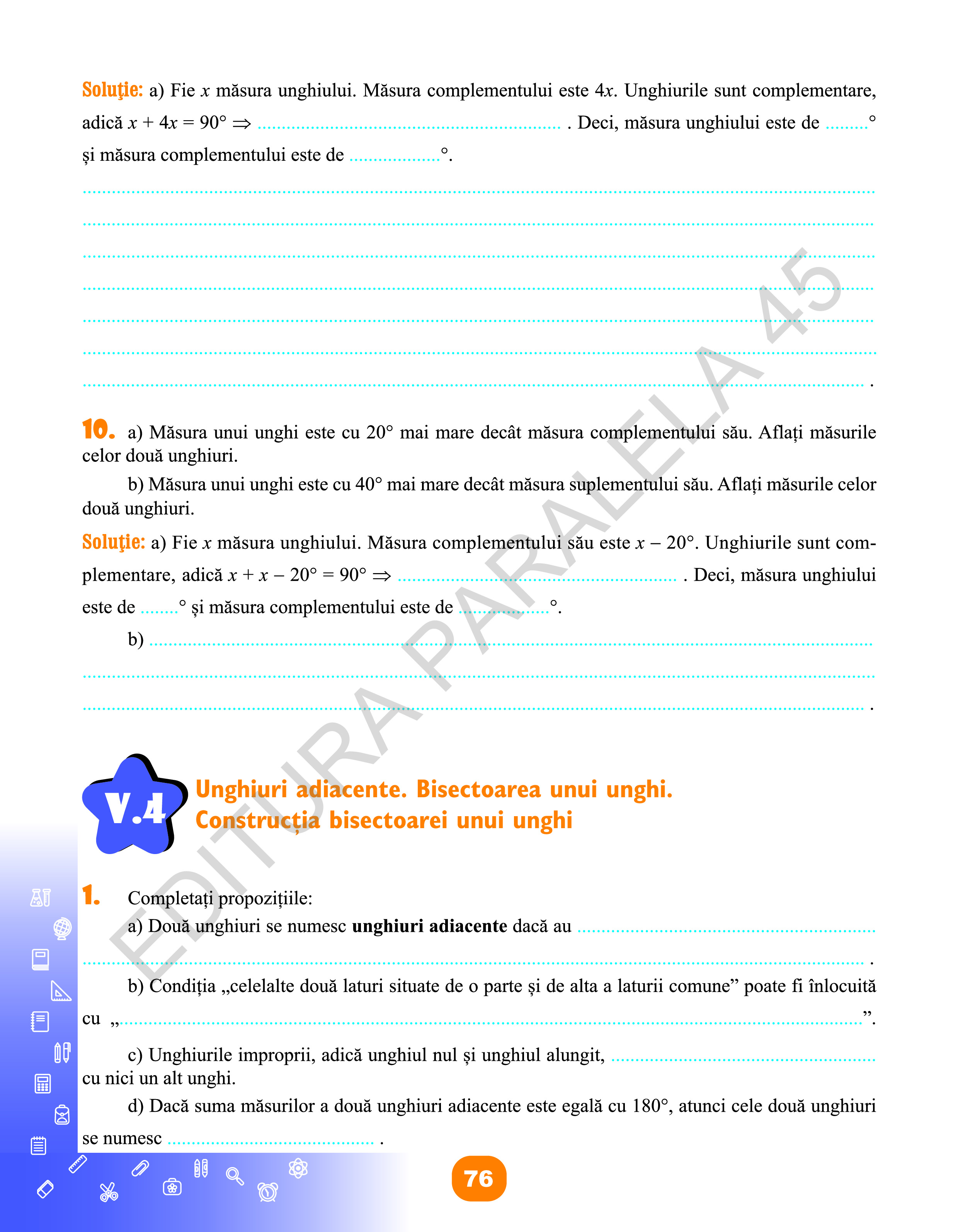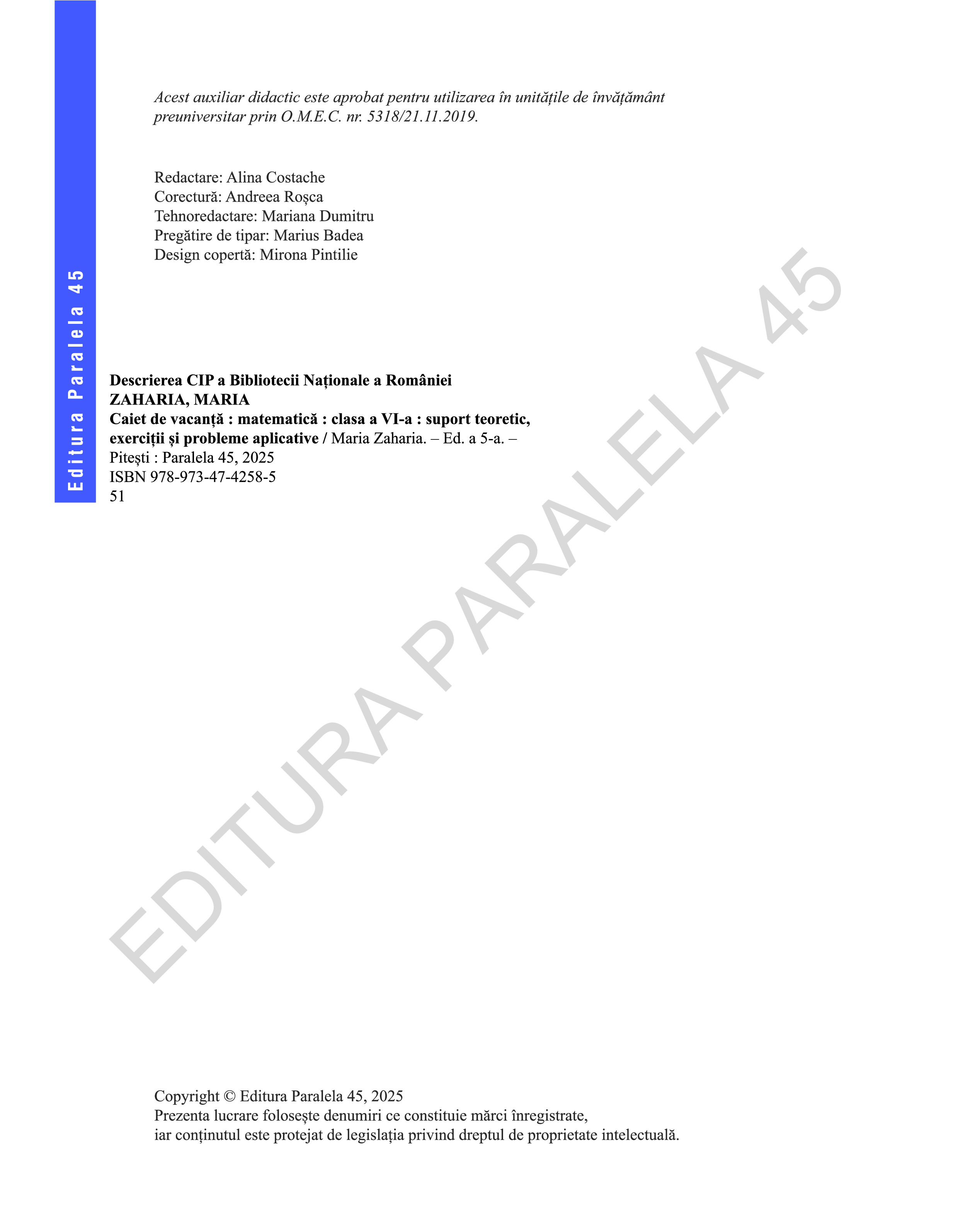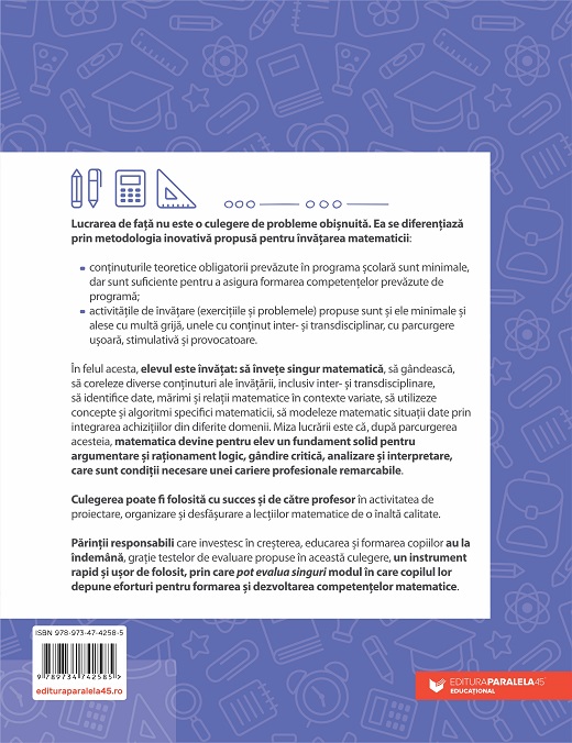 Culegerea poate fi folosită cu succes și de către profesor în activitatea de proiectare, organizare și desfășurare a lecțiilor matematice de o înaltă calitate.