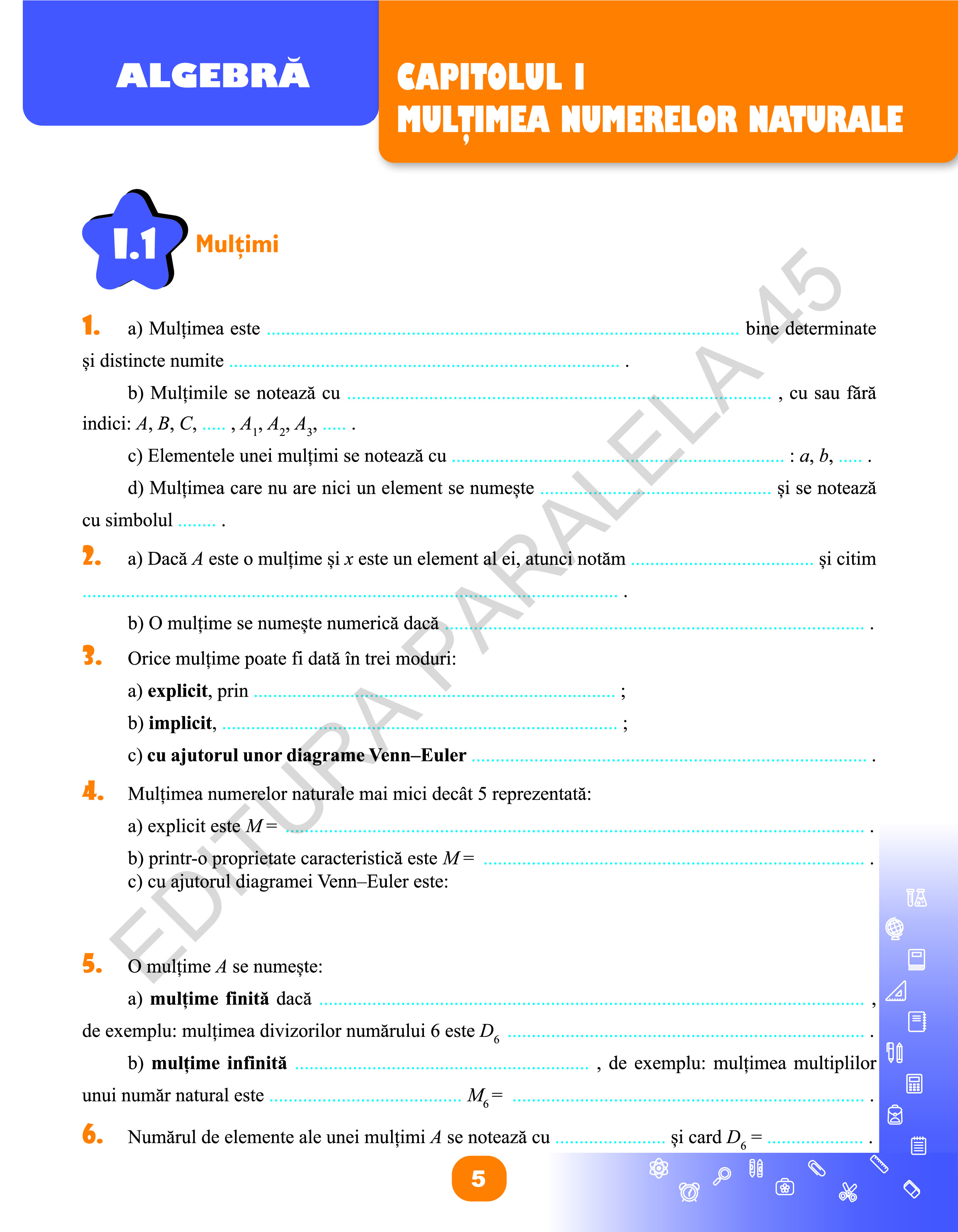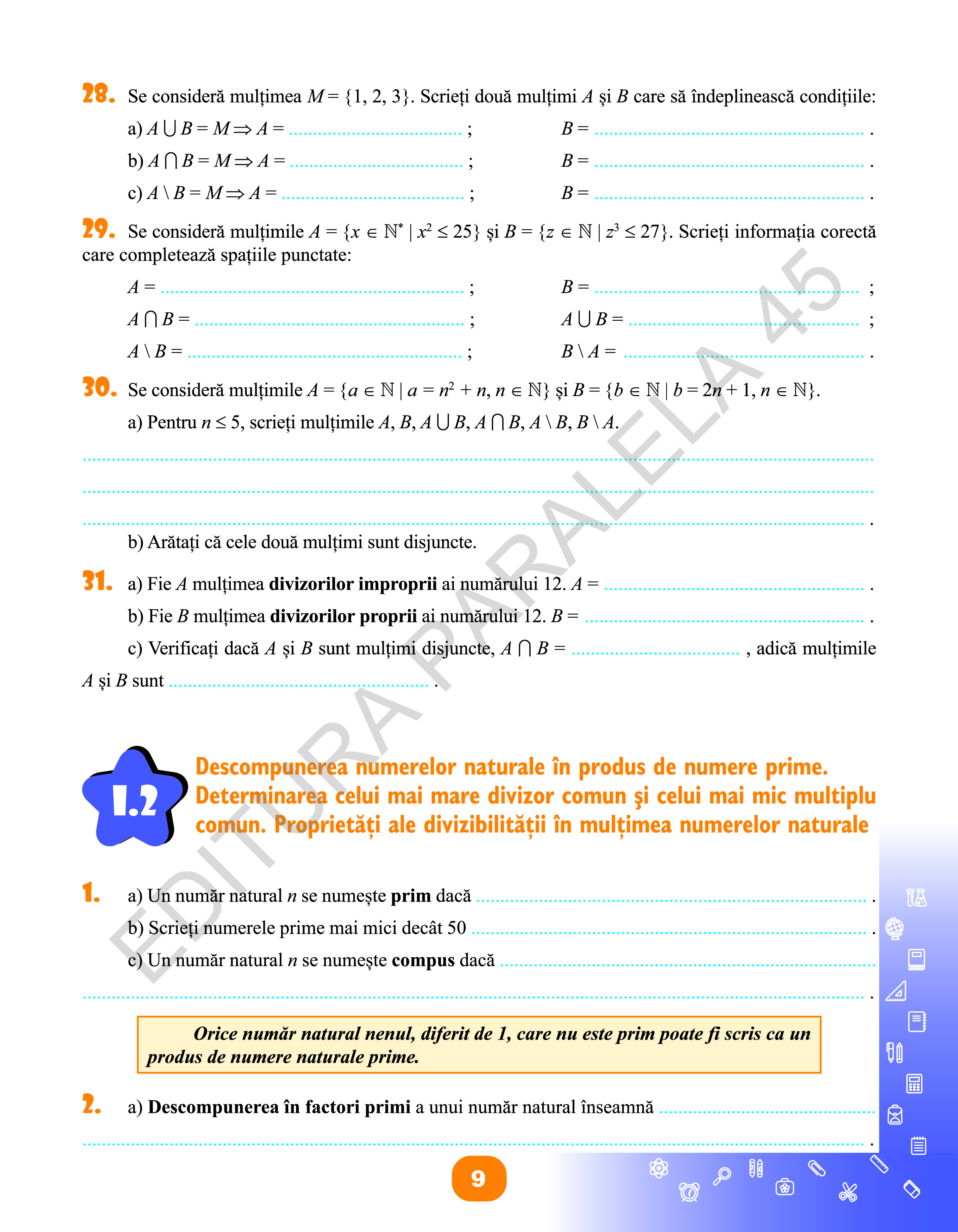 • activitățile de învățare (exercițiile și problemele) propuse sunt și ele minimale și alese cu multă grijă, unele cu conținut inter- și transdisciplinar, cu parcurgere ușoară, stimulativă și provocatoare.