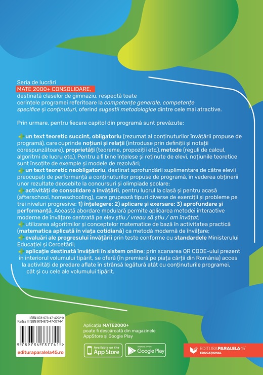 Seria de lucrări MATE 2000+ CONSOLIDARE, destinată claselor de gimnaziu, respectă toate cerințele programei referitoare la competențe generale, competențe specifice și conținuturi, oferind sugestii metodologice dintre cele mai atractive.