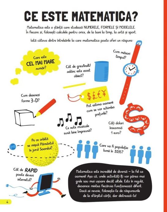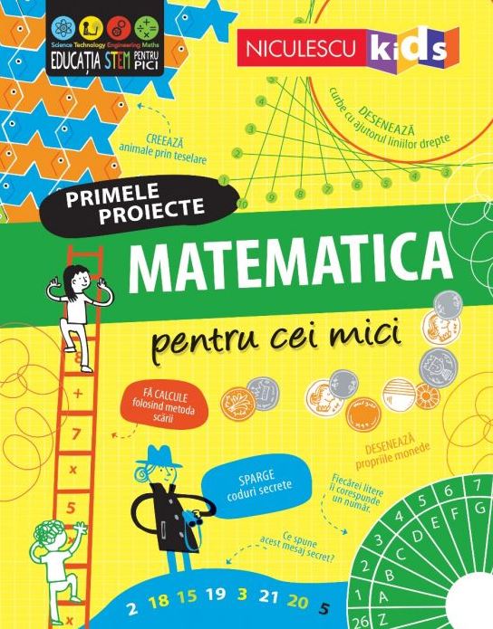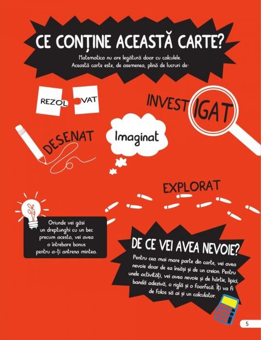 GÂNDEȘTE ca un matematician în această carte de activități, cu puzzle-uri de REZOLVAT, coduri de SPART, imagini de DESENAT, și multe alte lucruri fascinante.