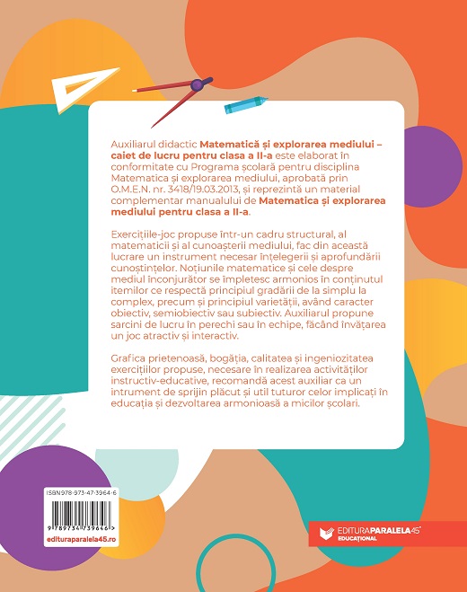 Auxiliarul didactic Matematică și explorarea mediului – caiet de lucru pentru clasa a II-a este elaborat în conformitate cu Programa școlară pentru disciplina Matematica și explorarea mediului, aprobată prin O.M.E.N. nr. 3418/19.03.2013, și reprezintă un material complementar manualului de Matematica și explorarea mediului pentru clasa a II-a.
