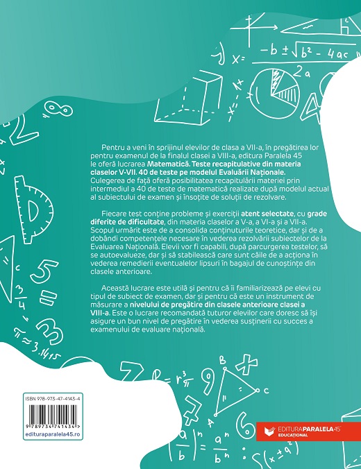 Pentru a veni în sprijinul elevilor de clasa a VII-a, în pregătirea lor pentru examenul de la finalul clasei a VIII-a, editura Paralela 45 le oferă lucrarea Matematică. Teste recapitulative din materia claselor V-VII. 40 de teste pe modelul Evaluării Naţionale. Culegerea de față oferă posibilitatea recapitulării materiei prin intermediul a 40 de teste de matematică realizate după modelul actual al subiectului de examen și însoțite de soluții de rezolvare.