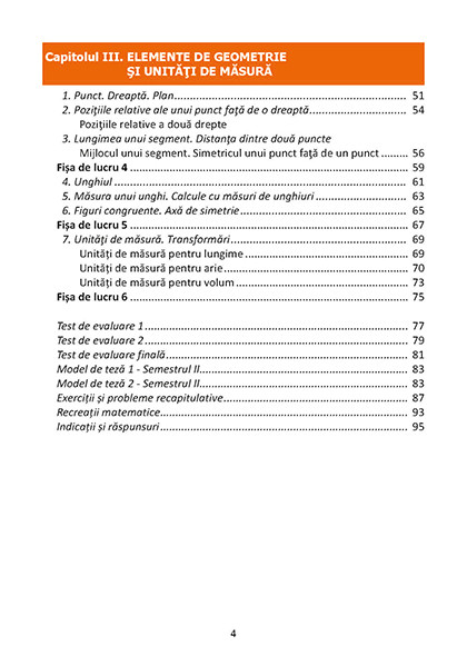 Lucrarea conține exerciţiile şi problemele grupate pe trei niveluri de dificultate şi evidenţiate în text prin vignietele: Exersează!, Poţi fi mai bun! şi Fii campion!. De asemenea auxiliarul cuprinde fişe de lucru pentru elevi, teste de recapitulare şi sistematizare și modele de teză. Fișele de lucru pot fi decupate și adăugate portofoliului individual al fiecărui elev. Auxiliarul „Vrei să ştii mai mult?” pentru semestrul II cuprinde două capitole: - Capitolul „Fracţii ordinare. Fracţii zecimale” cu subcapitolul „Fracţii zecimale” Auxiliarul „Vrei să ştii mai mult?” pentru semestrul II este dedicat: - Capitolul „Elemente de geometrie și unități de măsură”. Ca și în auxiliarul pentru semestrul I, și acest auxiliar găsim „Recreații matematice“, dedicat vacanțelor școlare prin care elevii sunt stimulați și motivați să-şi dezvolte logica matematică inspirată din frumuseţea şi eleganţa raţionamentului matematica. În concluzie putem spune că lucrarea facilitează interactivitatea elev-profesor, relaționarea explicită și implicită cu alte discipline, autoevaluarea și înregistrarea progresului fiecărui elev în parte.