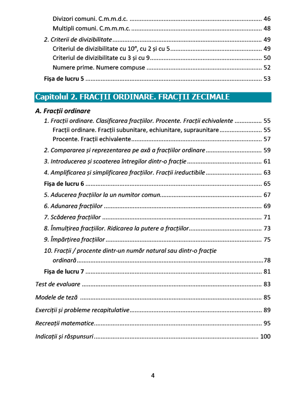- Capitolului I „Numere naturale” cu subcapitolele „Operaţii cu numere naturale” şi „Divizibiliatatea numerelor naturale”