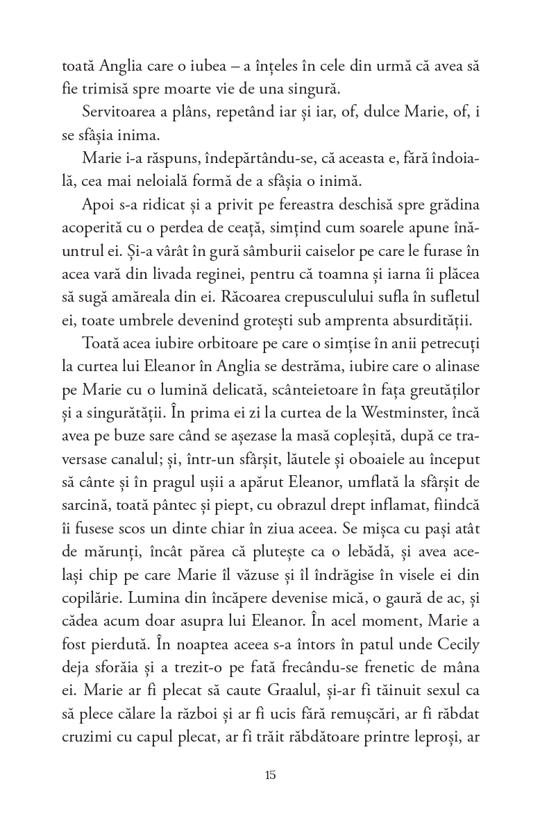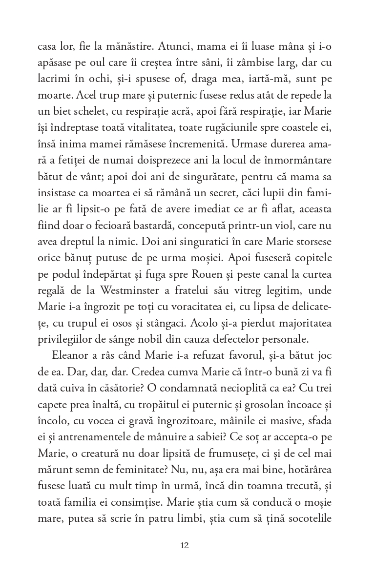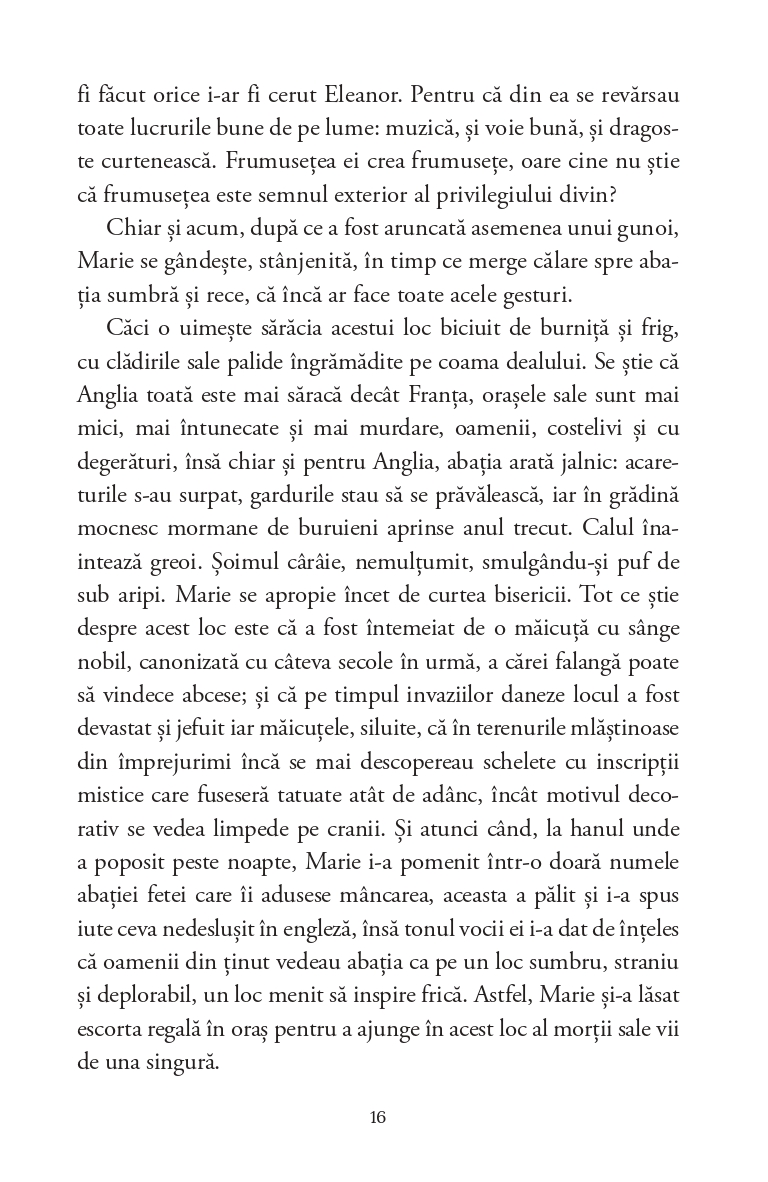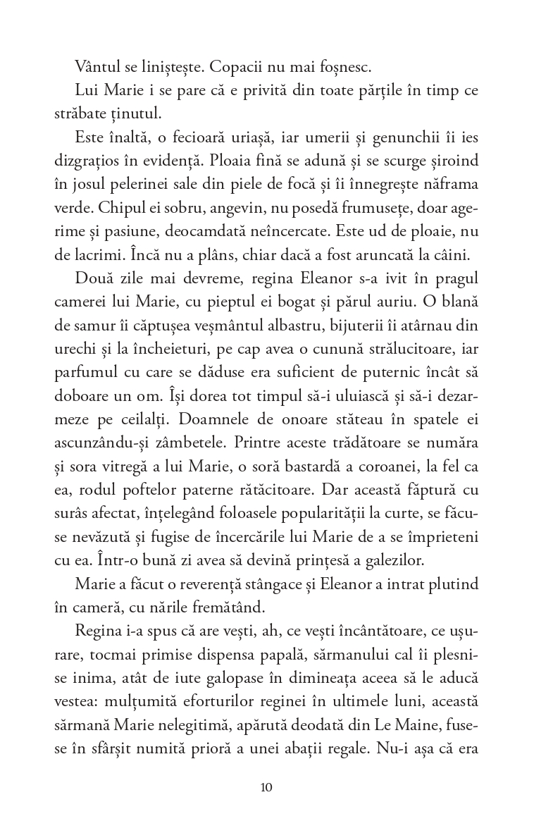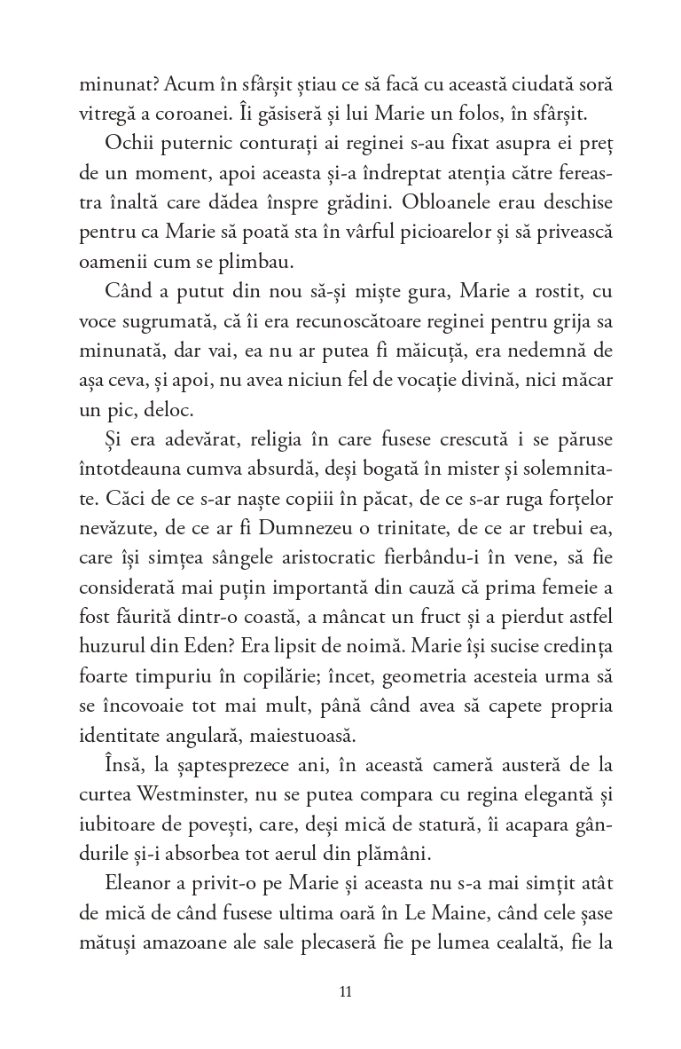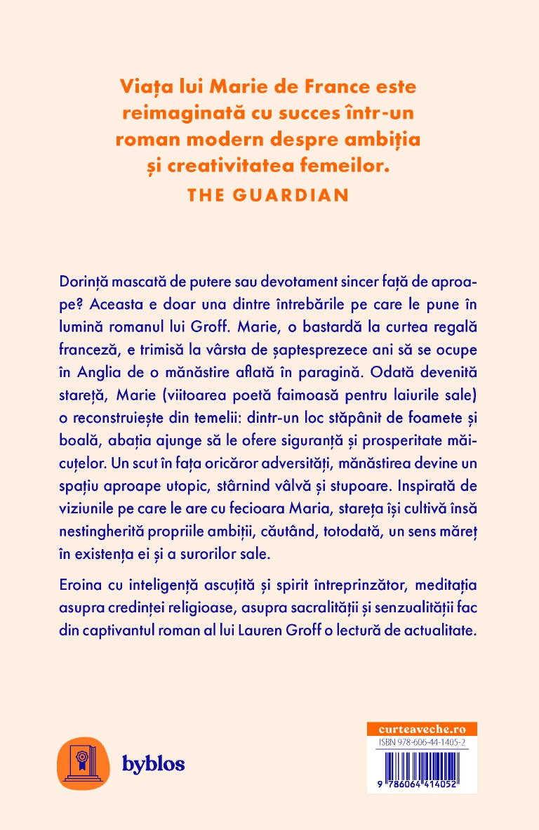 Dorință mascată de putere sau devotament sincer față de aproape? Aceasta e doar una dintre întrebările pe care le pune în lumină romanul lui Groff. Marie, o bastardă la curtea regală franceză, e trimisă la vârsta de șaptesprezece ani să se ocupe în Anglia de o mănăstire aflată în paragină. Odată devenită stareță, Marie (viitoarea poetă faimoasă pentru laiurile sale) o reconstruiește din temelii: dintr-un loc stăpânit de foamete și boală, abația ajunge să le ofere siguranță și prosperitate măicuțelor. Un scut în fața oricăror adversități, mănăstirea devine un spațiu aproape utopic, stârnind vâlvă și stupoare. Inspirată de viziunile pe care le are cu fecioara Maria, stareța își cultivă însă nestingherită propriile ambiții, căutând, totodată, un sens măreț în existența ei și a surorilor sale.