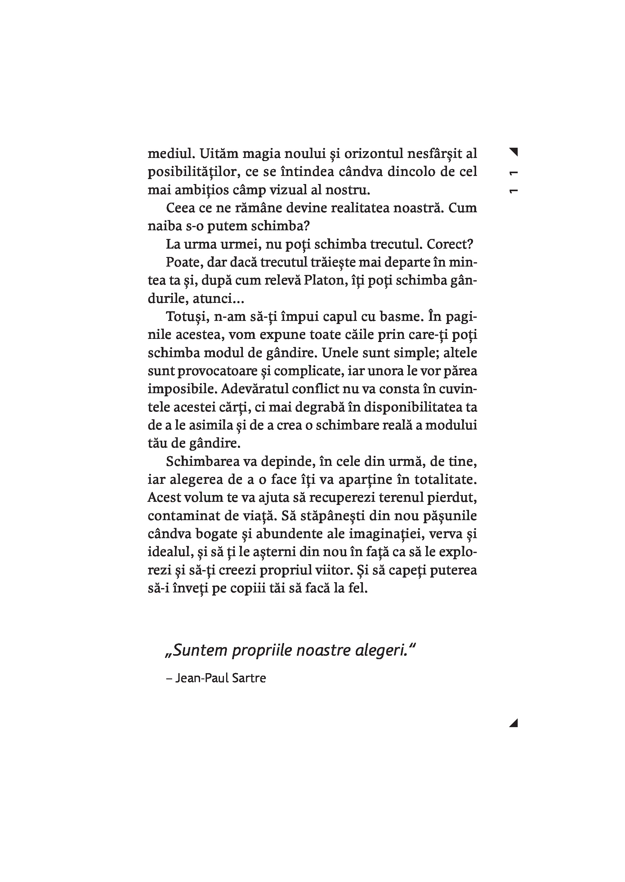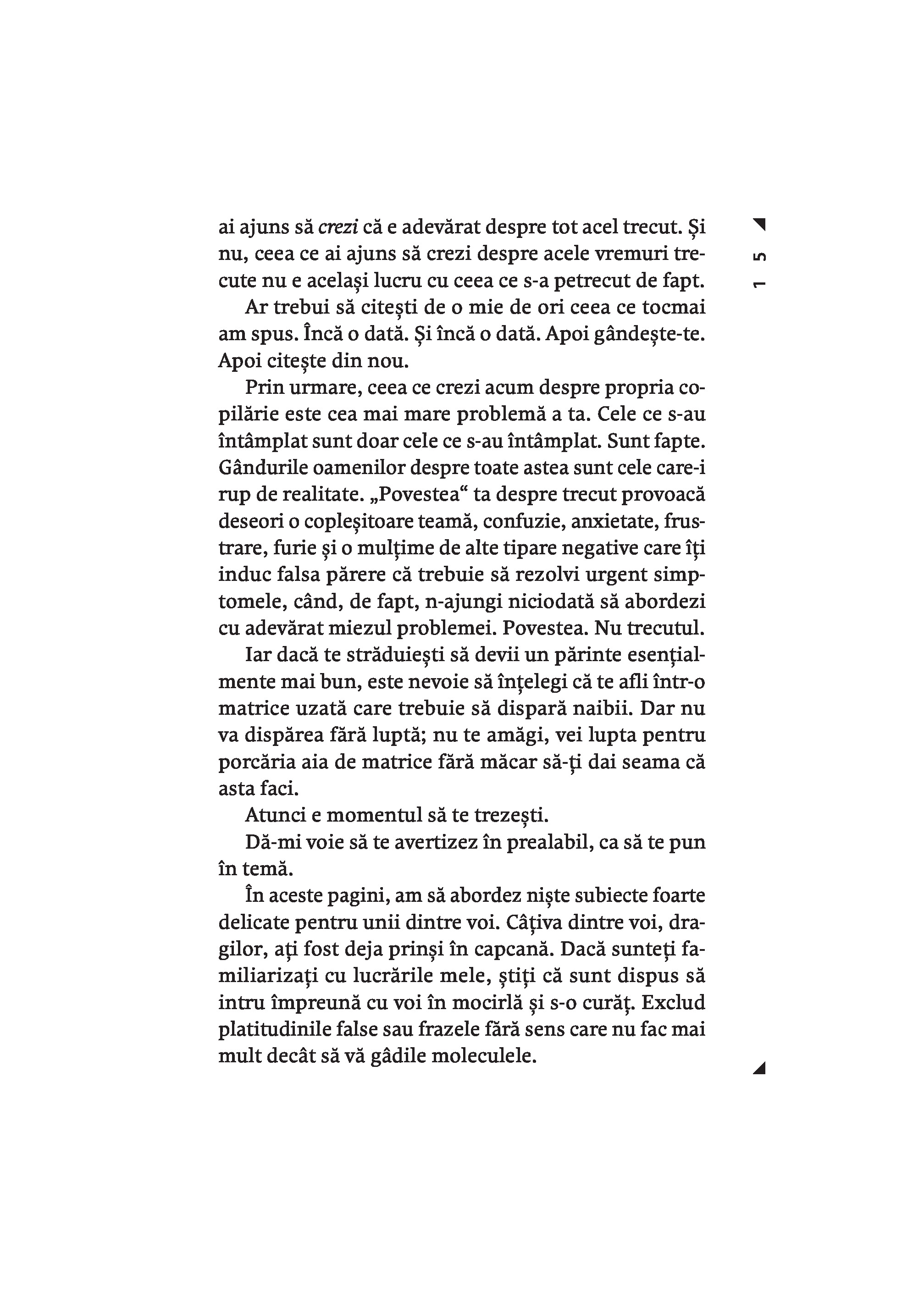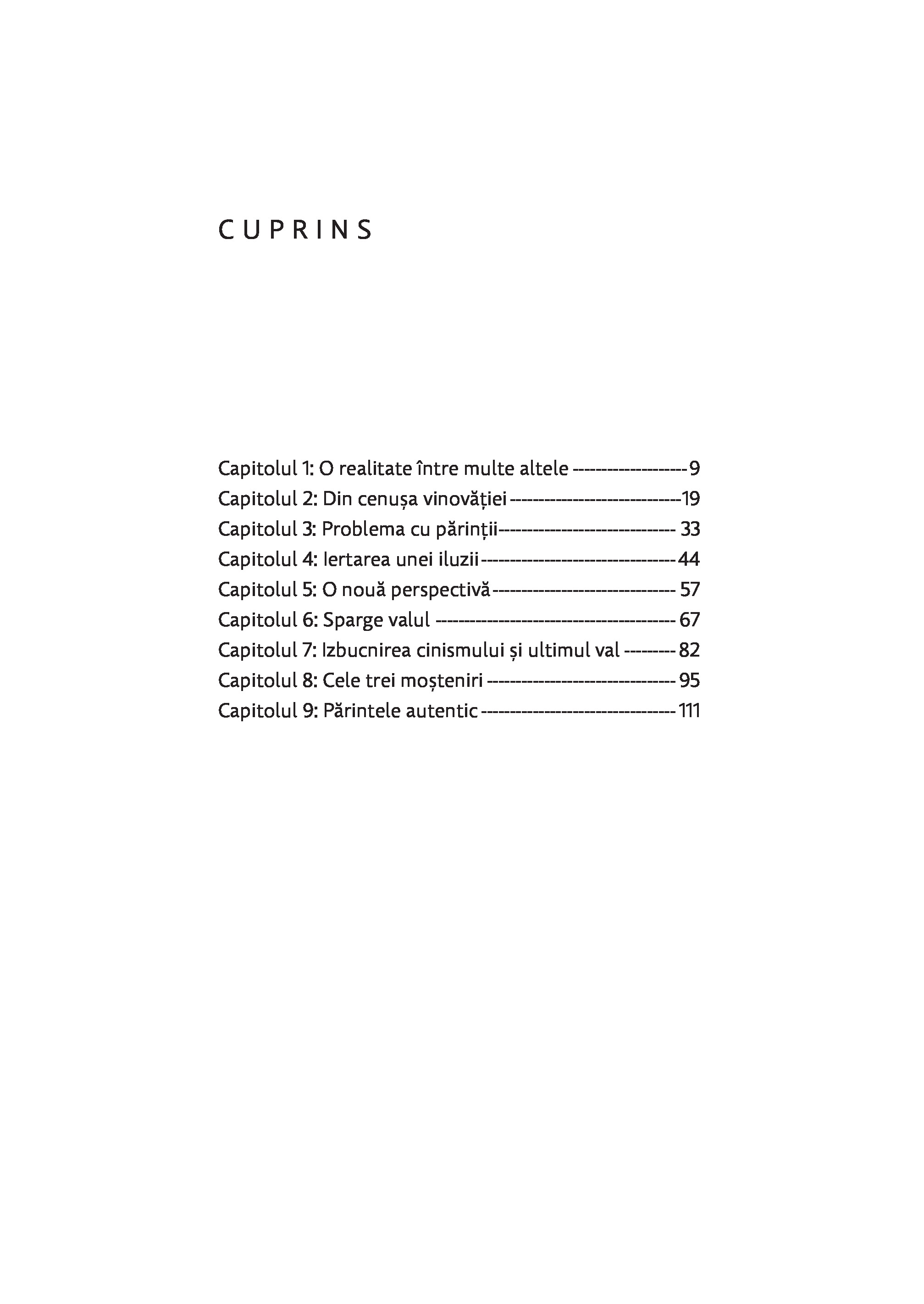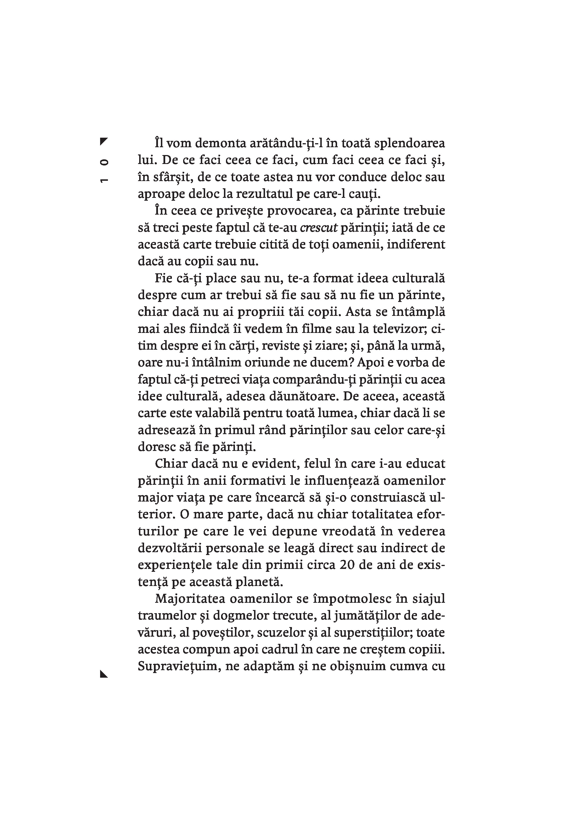 Fie că ești părinte, vrei să devii părinte sau pur și simplu ai părinți, cartea de față scoate la lumină adevăruri esențiale despre cine ești și cum te prezinți lumii – de ele depinde capacitatea de a prelua total controlul asupra direcției vieții tale și a le arăta copiilor cum să-și urmeze propriul drum.
