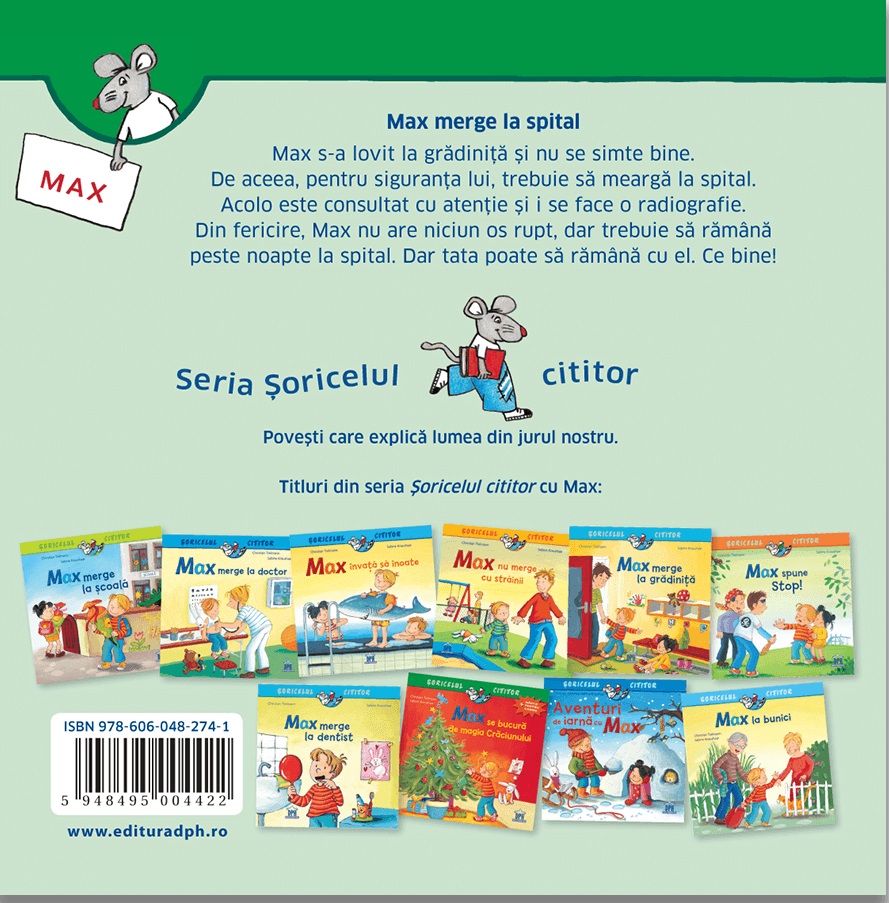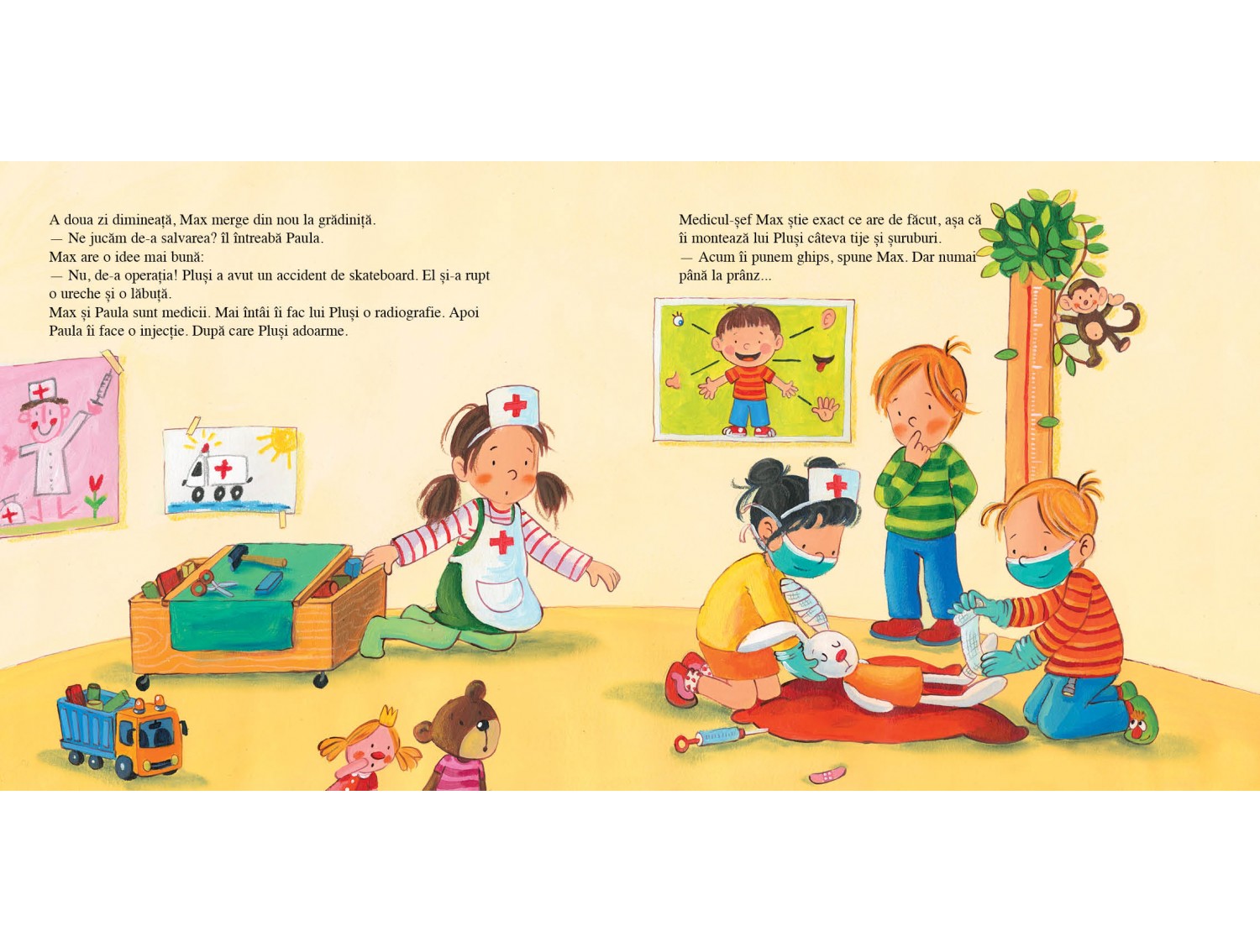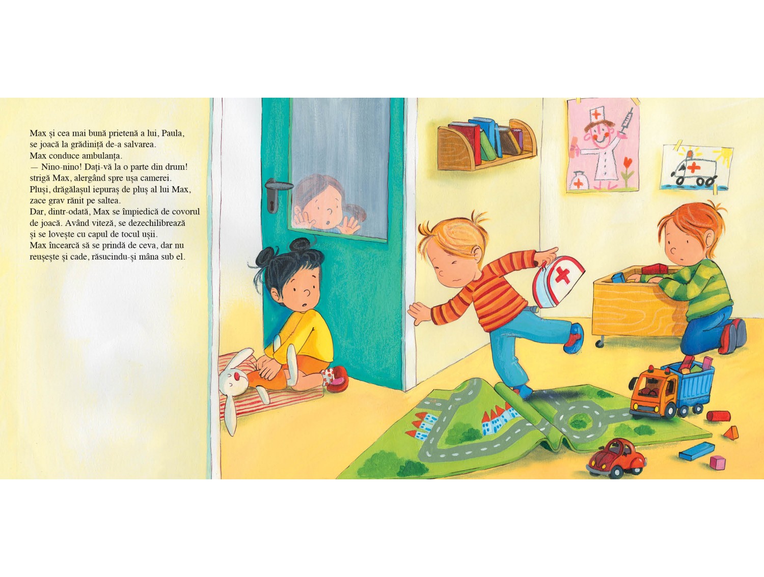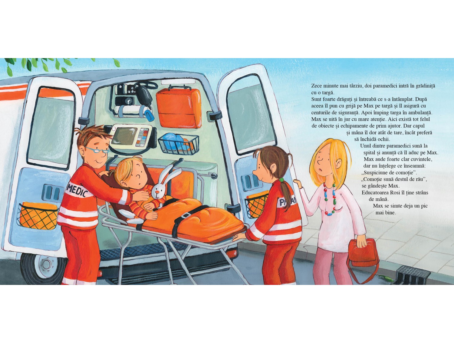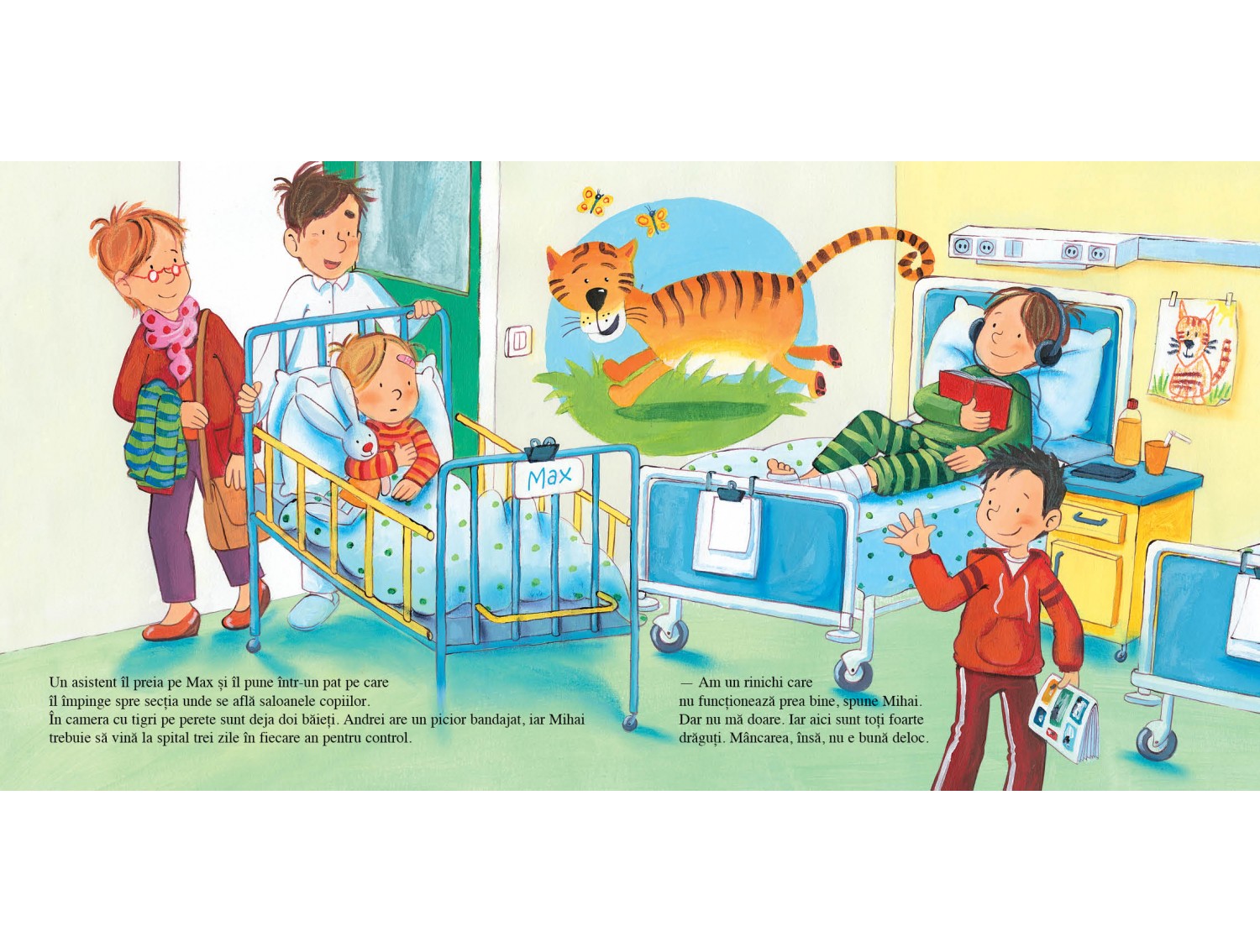 Max s-a lovit la grădiniță și nu se simte bine. De aceea, pentru siguranța lui, trebuie să meargă la spital. Acolo este consultat cu atenție și i se face o radiografie. Din fericire, Max nu are niciun os rupt, dar trebuie să rămână peste noapte la spital. Dar tata poate să rămână cu el. Ce bine!