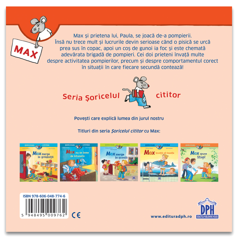 Max și brigada de pompieri este o carte care prezintă o poveste captivantă pentru copiii mici despre curaj și responsabilitate, învățându-i despre munca pompierilor și despre cum să reacționeze în situații de urgență.