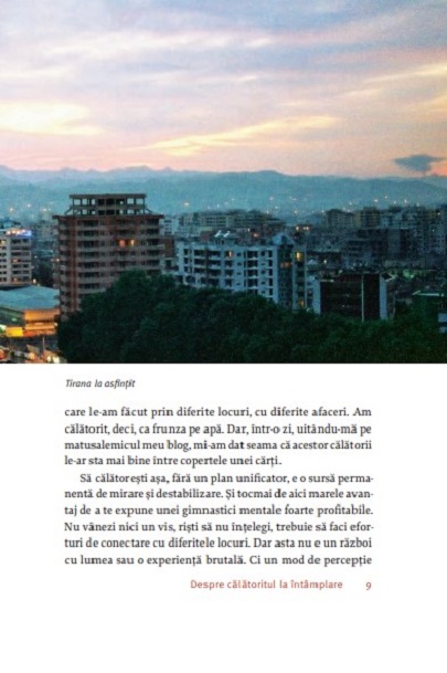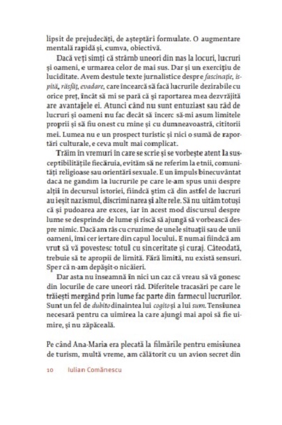„Un celebru «autor de călătorii» din Antichitate, Platon, vizitează o peșteră ai cărei locuitori sunt legați în lanțuri, cu spatele la un foc. Aceștia nu pot vedea, deci, decât umbrele de pe perete, despre care își închipuie că sunt realitatea. Atunci când sunt eliberați, își dau seama de sărăcia și distorsiunea umbrelor pe care le luau drept realitate. Dincolo de sensurile filozofice ale alegoriei, fiecare dintre noi avem peștera și lanțurile noastre, fie că se numesc apartament, țară, rutină zilnică sau carantină. Ieșirea din ea e pe alocuri dureroasă, fiindcă avem, precum «turiștii» lui Platon, ochii plini de întuneric. E important însă să scăpăm de lanțuri, să ne dezlănțuim, și să ne uităm puțin în jur. A cunoaște lumea la întâmplare e neprețuit, fiindcă nu presupune căutarea unor confirmări. Și tocmai lipsa unui vis director ne face mai expuși la lucruri și, în cele din urmă, mai bogați.“ — IULIAN COMĂNESCU