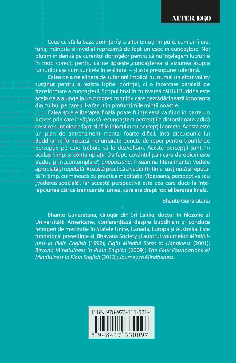 In prezentul volum, Bhante Gunaratana, autorul bestseller-ului Mindfulness pe intelesul tuturor, propune practica buddhista a meditatiei asupra perceptiei pentru a afla cum modificarea propriei perspective ne poate transforma sanatatea mentala si fizica.