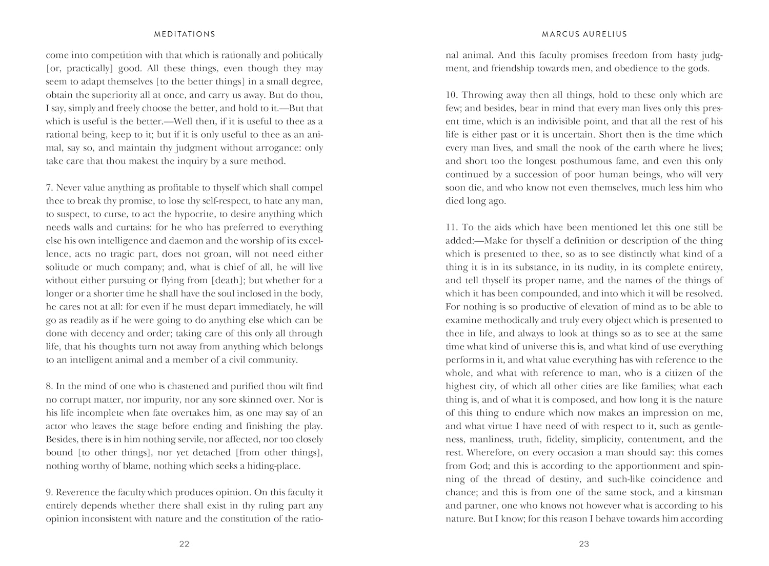 Meditations is a collection of personal writings, ruminations, and reflections by the second-century Roman emperor Marcus Aurelius, composed during his reign from AD 161 to 180. Though not formally published during his lifetime, these reflections on Stoic philosophy and the nature of existence have since been compiled into one of the most influential works of ancient philosophy.