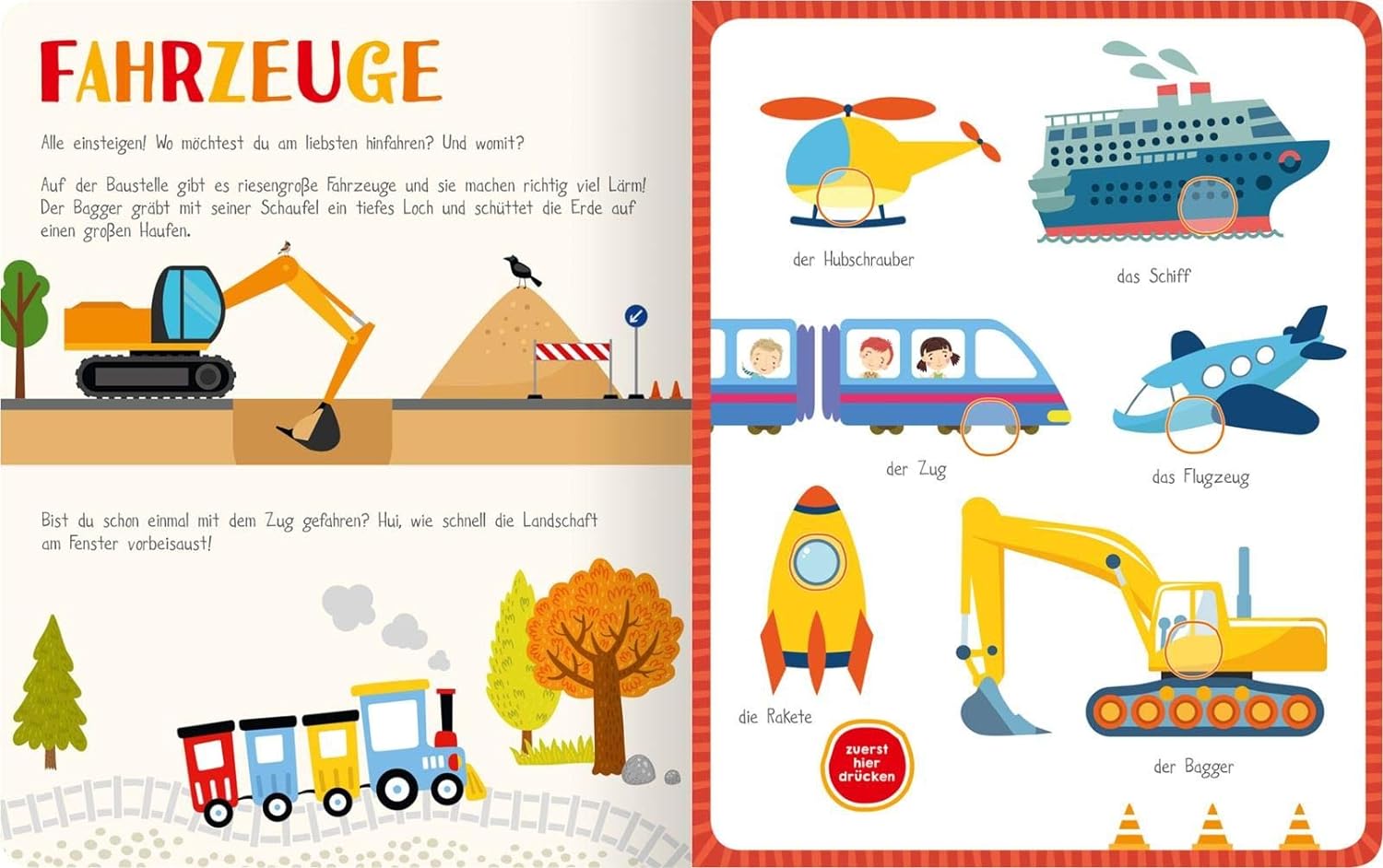 Alles hat einen Namen! Diese wichtige Erfahrung ist für jedes Kind ein großer Schritt auf dem Weg zum Spracherwerb. In diesem kunterbunten Soundbuch ab 24 Monaten sind Gegenstände aus dem kindlichen Alltag und erste Lieblingstiere abgebildet, die auf Knopfdruck von einer professionellen Sprecherin vorgelesen und um ein lustiges, zugehöriges Geräusch ergänzt werden. 50 Wörter und ihre Geräusche laden zum Entdecken, Wiedererkennen und Nachsprechen ein und fördert so spielerisch das Sprechen.