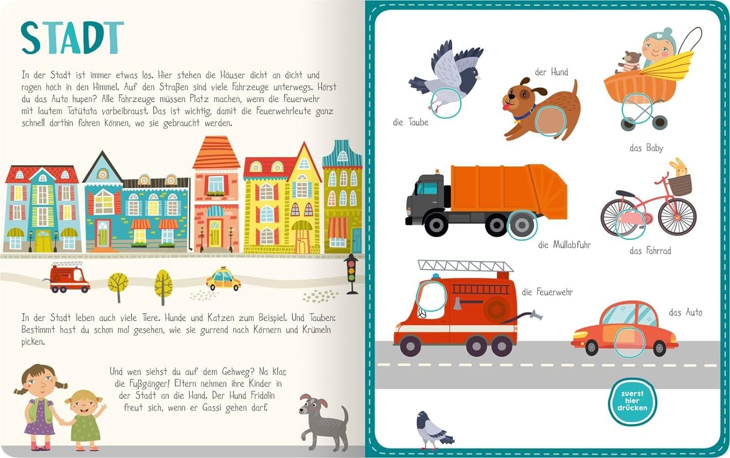 Komm mit auf den Bauernhof, in den Wald, in die Stadt, in den Garten, ins Haus, zu den Fahrzeugen und in den Zoo – und entdecke dabei allererste Wörter und Geräusche. So geht’s: erst mit dem roten Button die jeweilige Themenseite aktivieren und dann auf die einzelnen Bilder drücken, um das Wort vorlesen zu lassen.