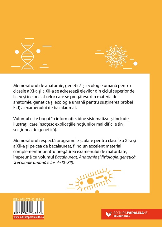 Memoratorul de anatomie, genetică și ecologie umană pentru clasele a XI-a și a XII-a se adresează elevilor din ciclul superior de liceu și în special celor care se pregătesc din materia de anatomie, genetică și ecologie umană pentru susținerea probei E.d) a examenului de bacalaureat.