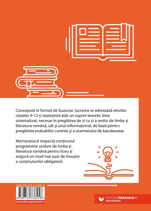 Memoratorul respectă conținutul programelor școlare de limba și literatura română pentru liceu și asigură un mod mai ușor de însușire a conținuturilor obligatorii.