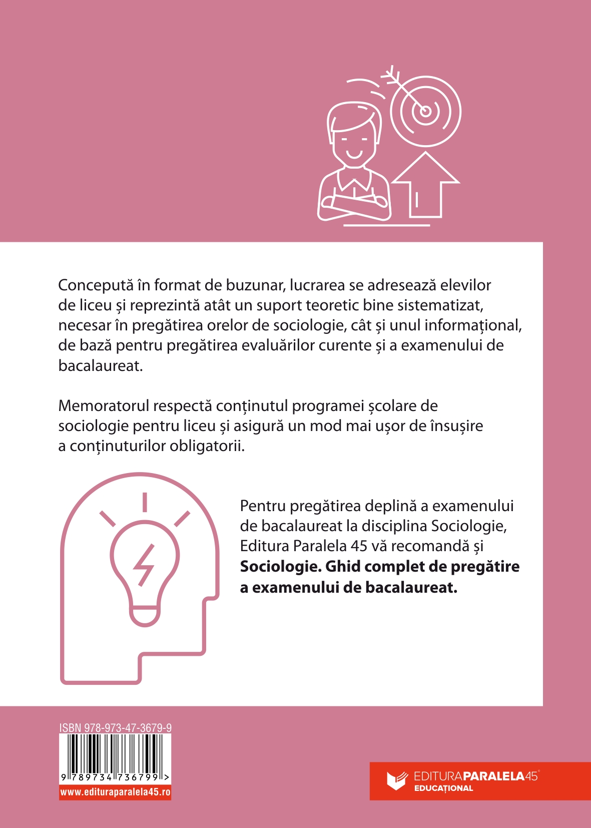 Concepută în format de buzunar, lucrarea se adresează elevilor de liceu și reprezintă atât un suport teoretic bine sistematizat, necesar în pregătirea orelor de sociologie, cât și unul informațional, de bază pentru pregătirea evaluărilor curente și a examenului de bacalaureat.