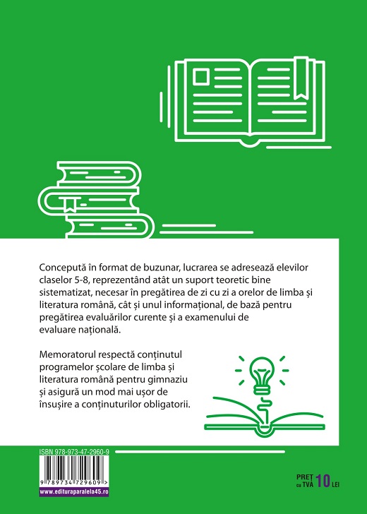 Memoratorul respectă conținutul programelor școlare de limba și literatura română pentru gimnaziu și asigură un mod mai ușor de însușire a conținuturilor obligatorii.