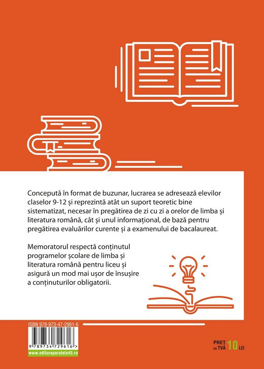 Memoratorul respectă conținutul programelor școlare de limba și literatura română pentru liceu și asigură un mod mai ușor de însușire a conținuturilor obligatorii.