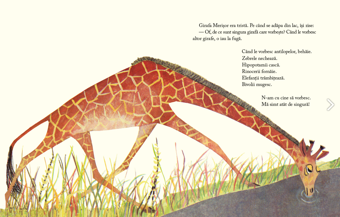 Merișor este o girafă care știe să vorbească. A învățat demult, pe când locuia la Grădina Zoologică. Dar acum, când trăiește în savană, se simte tare singură și tristă. Nici celelalte girafe, nici zebrele, nici elefanții nu pot să scoată o vorbă. Iar Merișor are atâtea de spus!