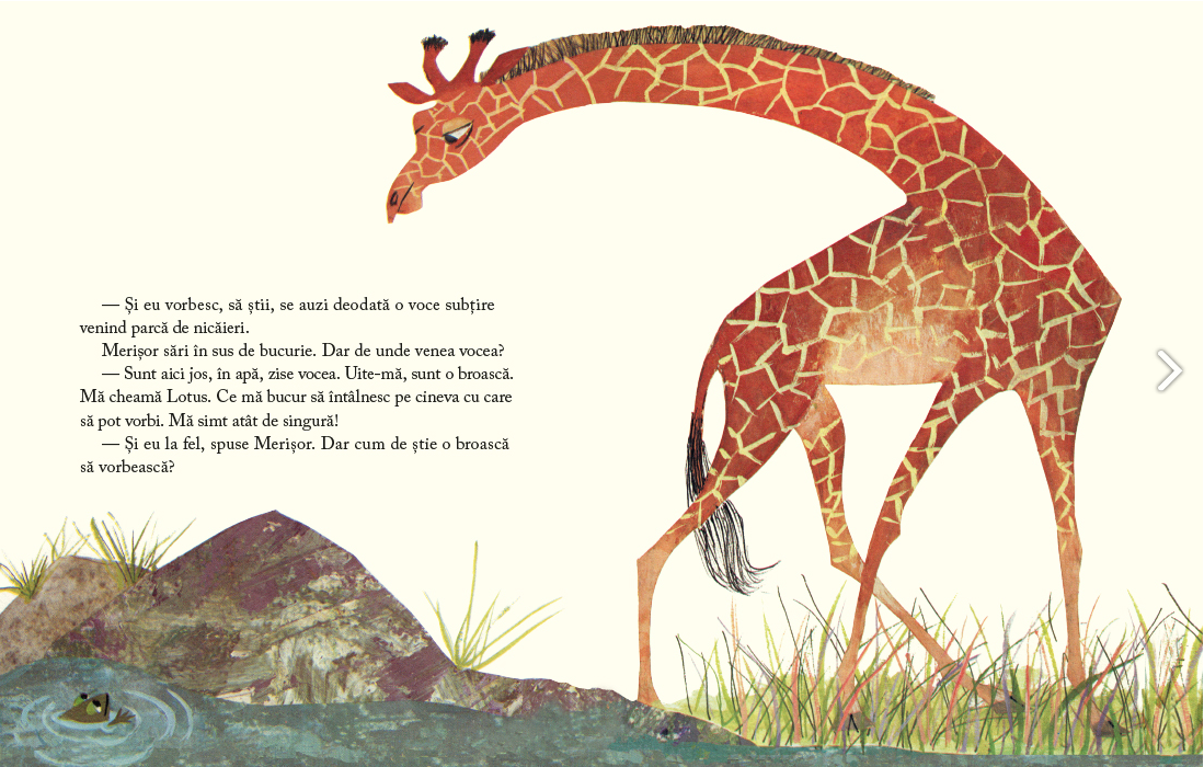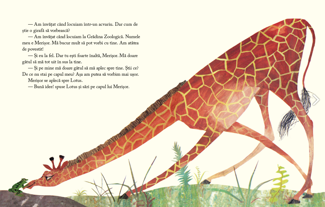 Dar iată că o broscuță pe nume Lotus știe și ea să vorbească de când trăia într-un acvariu. Ce bucurie pe Merișor să poată spune cuiva tot ce-i trece prin cap! Tot, tot. Și repede, dintr-o răsuflare. Chiar dacă și broscuța face la fel.