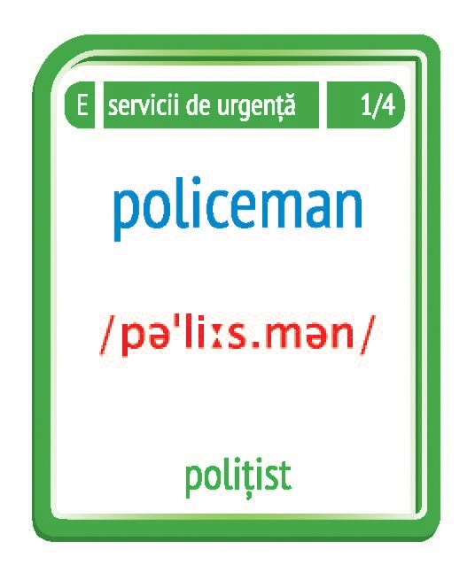 • 56 de carduri cu control al poziției. Fiecare card conține pe o față imaginea, iar pe verso cuvântul din limba engleză corespunzător, însoțit de traducere și transcriere fonetică;