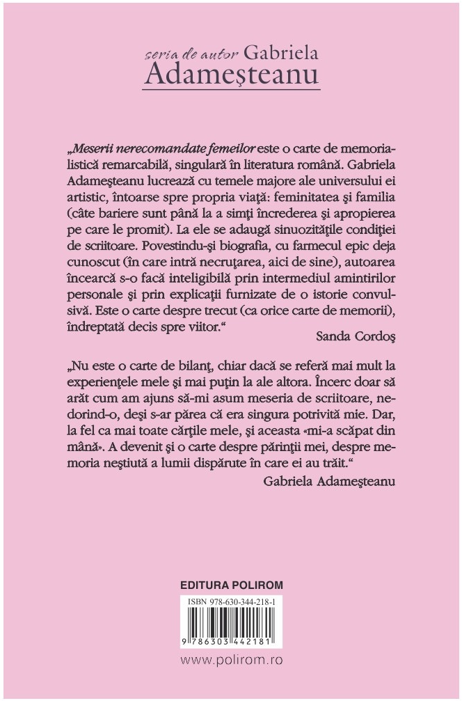 „Meserii nerecomandate femeilor este o carte de memorialistică remarcabilă, singulară în literatura română. Gabriela Adameșteanu lucrează cu temele majore ale universului ei artistic, întoarse spre propria viață: feminitatea și familia (câte bariere sunt până la a simți încrederea și apropierea pe care le promit). La ele se adaugă sinuozitățile condiției de scriitoare. Povestindu-și biografia, cu farmecul epic deja cunoscut (în care intră necruțarea, aici de sine), autoarea încearcă s-o facă inteligibilă prin intermediul amintirilor personale și prin explicații furnizate de o istorie convulsivă. Este o carte despre trecut (ca orice carte de memorii), îndreptată decis spre viitor.” (Sanda Cordoș)