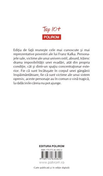 Editia de fata reuneste cele mai cunoscute si mai reprezentative povestiri ale lui Franz Kafka. Personajele sale, victime ale unui univers ostil, absurd, traiesc drama imposibilitatii unei evadari, atit din propria conditie, cit si dintr-un spatiu concentrationar exterior. Fie ca sint incatusate in corpul unei ginganii inspaimintatoare, fie ca sint victime ale unui sistem opresiv, aceste personaje au in comun o vina tragica, la radacinile careia nu pot ajunge.