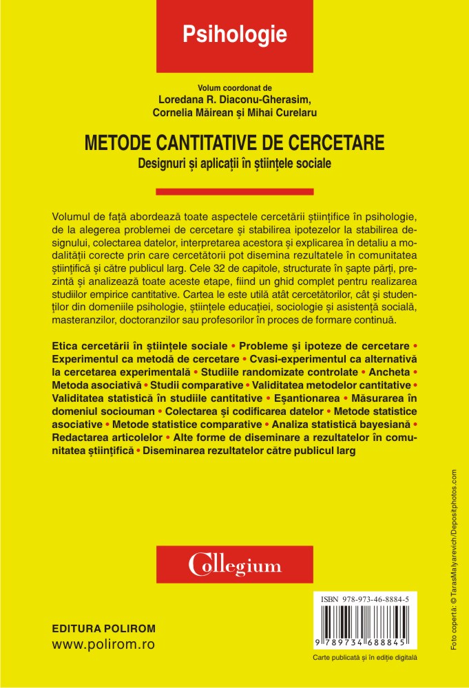 Volumul de față abordează toate aspectele cercetării științifice în psihologie, de la alegerea problemei de cercetare și stabilirea ipotezelor la stabilirea designului, colectarea datelor, interpretarea acestora și explicarea în detaliu a modalității corecte prin care cercetătorii pot disemina rezultatele în comunitatea științifică și către publicul larg. Cele 32 de capitole, structurate în șapte părți, prezintă și analizează toate aceste etape, fiind un ghid complet pentru realizarea studiilor empirice cantitative. Cartea le este utilă atât cercetătorilor, cât și studenților din domeniile psihologie, științele educației, sociologie și asistență socială, masteranzilor, doctoranzilor sau profesorilor în proces de formare continuă.