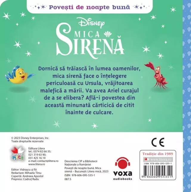 Dornică să trăiască în lumea oamenilor, mica sirenă face o înțelegere periculoasă cu Ursula, vrăjitoarea malefică a mării. Va avea Ariel curajul de a se elibera? Află-i povestea din această minunată cărticică de citit înainte de culcare.