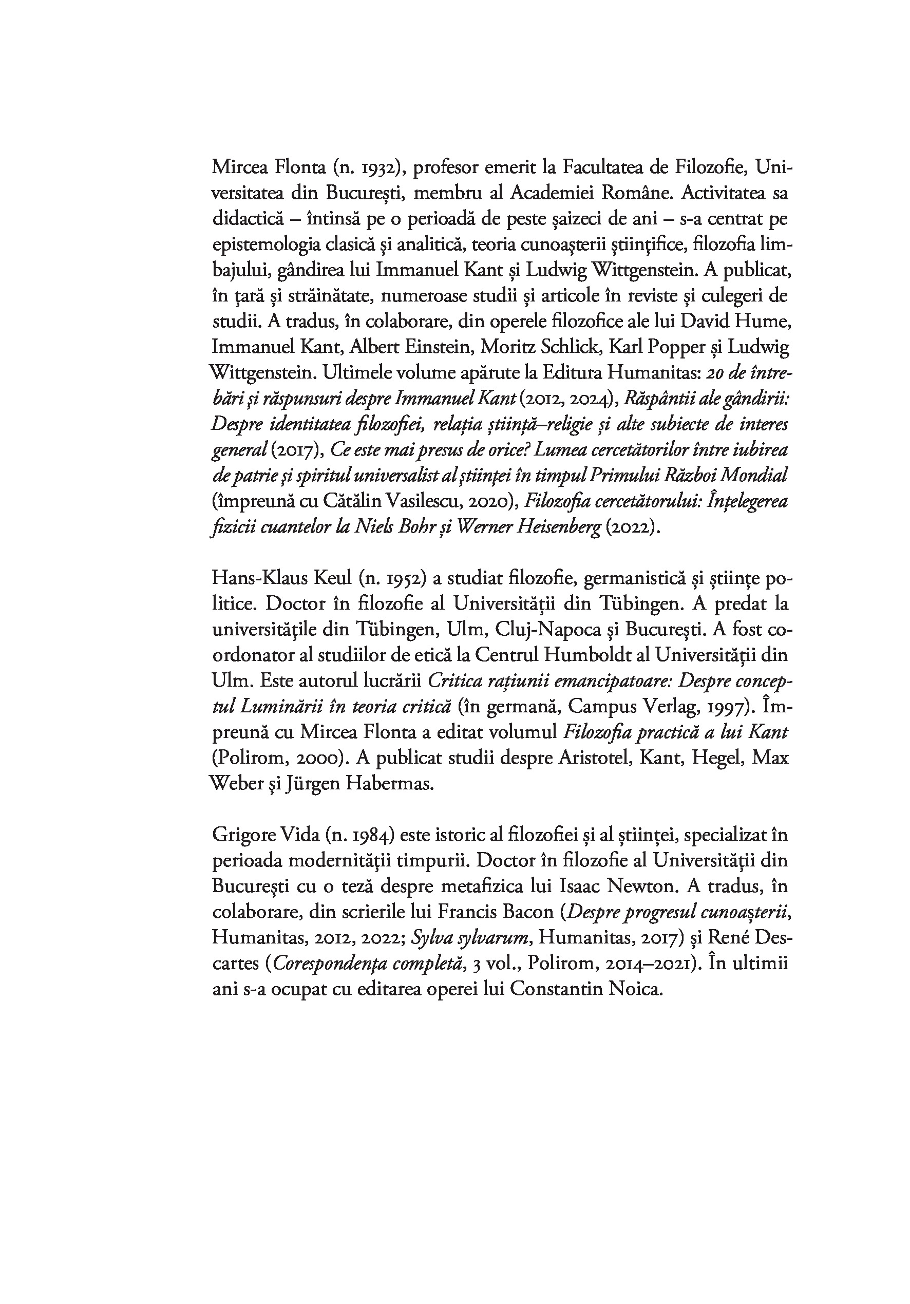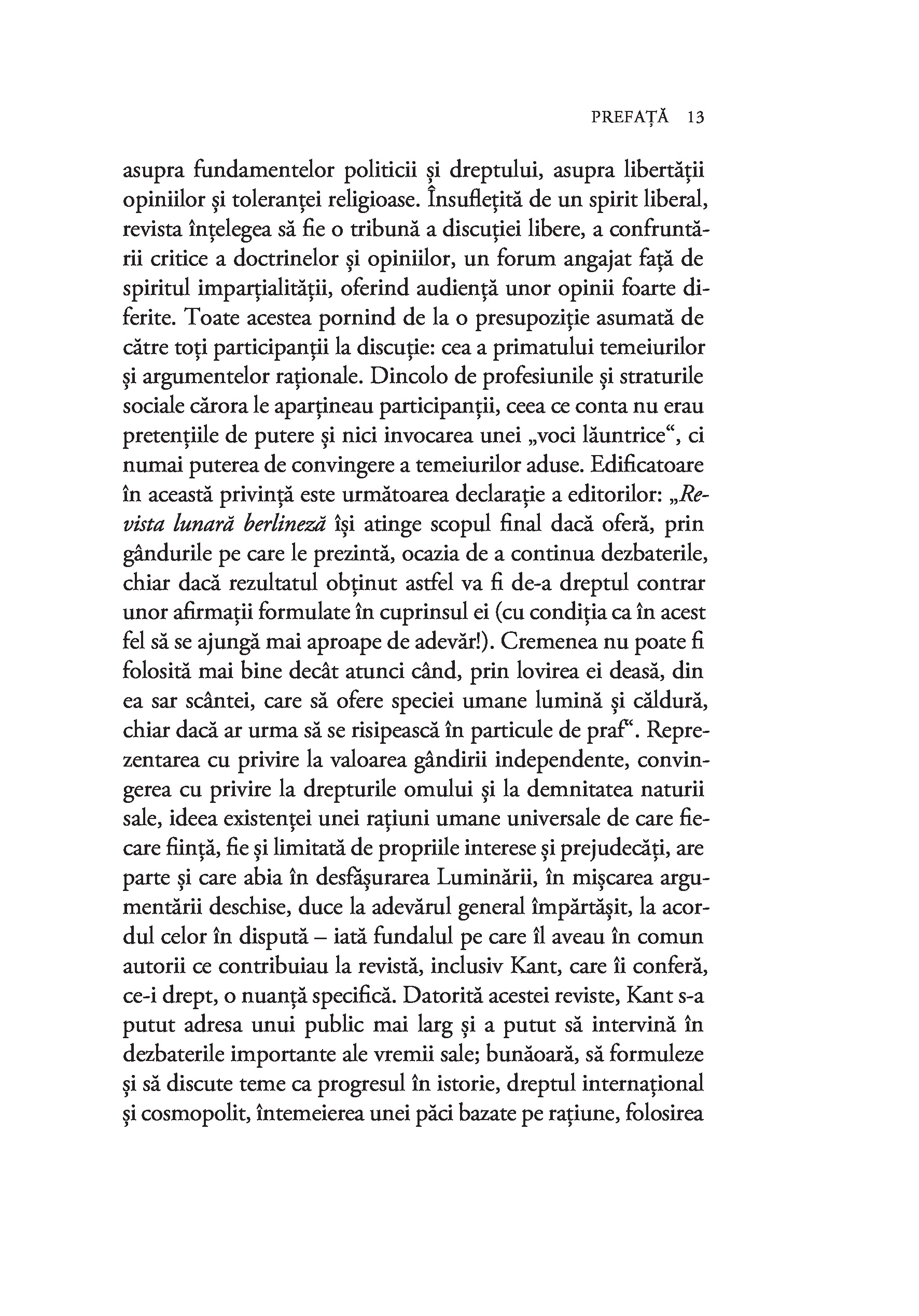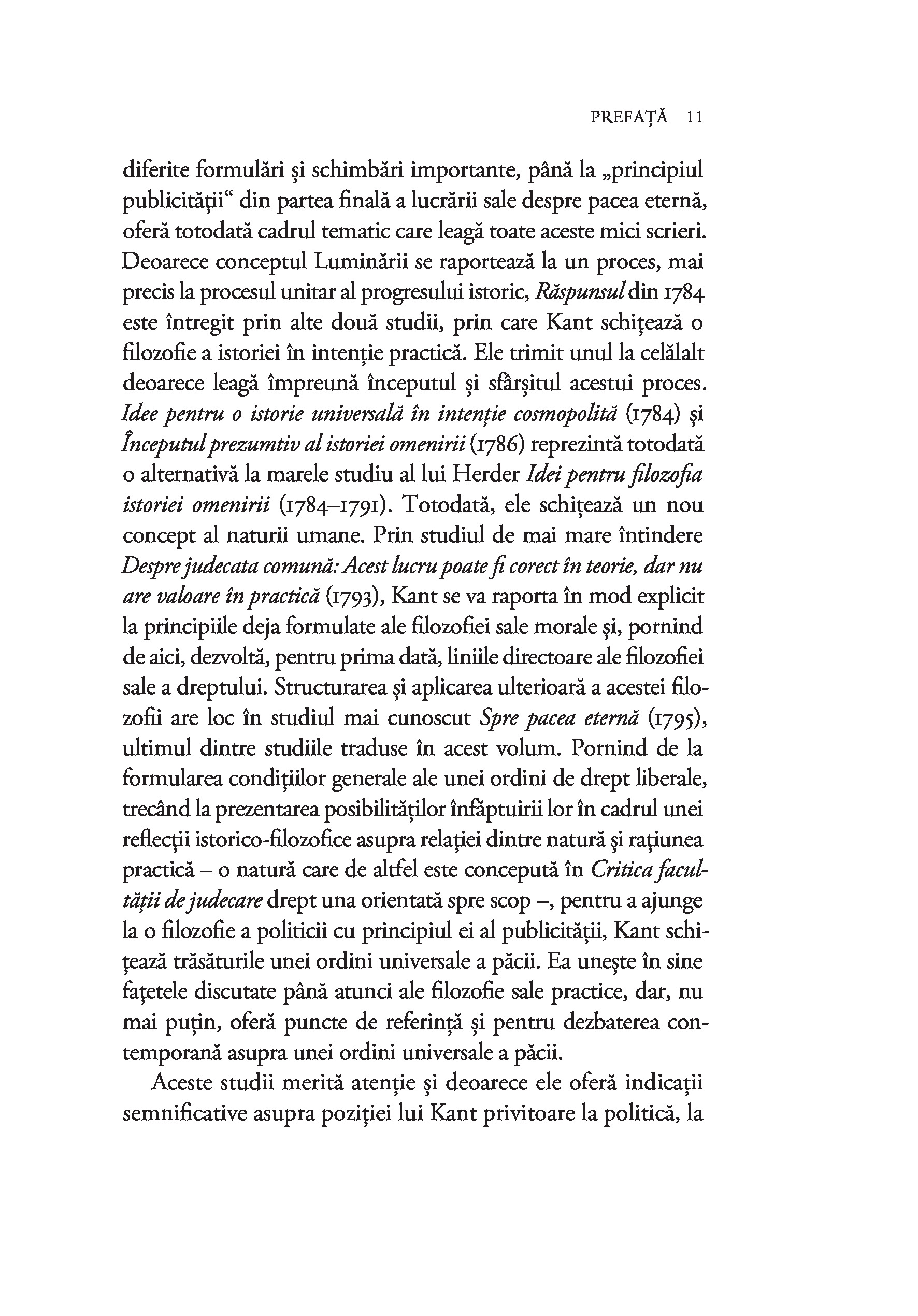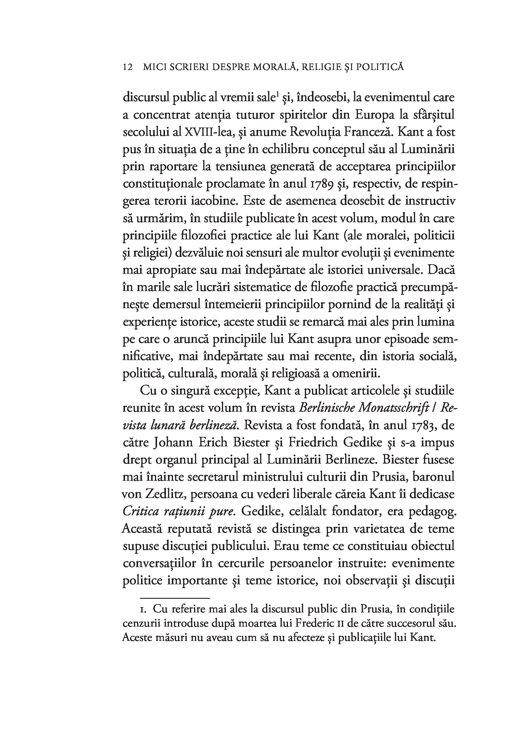 Astfel au luat naștere scrierile care alcătuiesc acest volum, dintre care unele sunt traduse pentru prima dată în limba română. Ele oferă o imagine mai cuprinzătoare și mai nuanțată asupra filozofiei morale, filozofiei religiei și filozofiei politice ale marelui gânditor german, de la a cărui naștere se împlinesc anul acesta trei sute de ani.