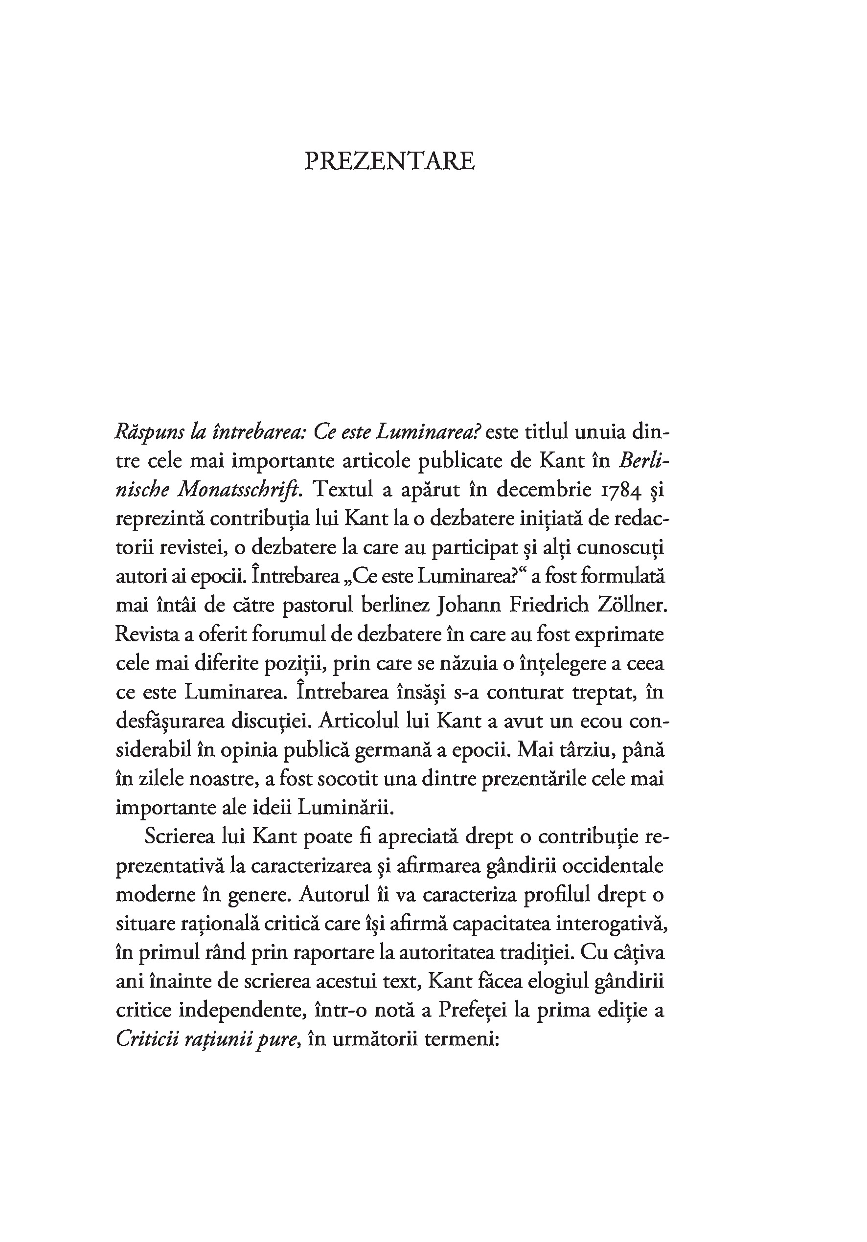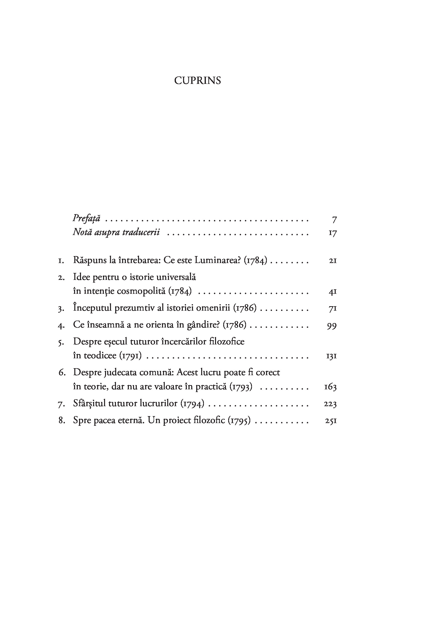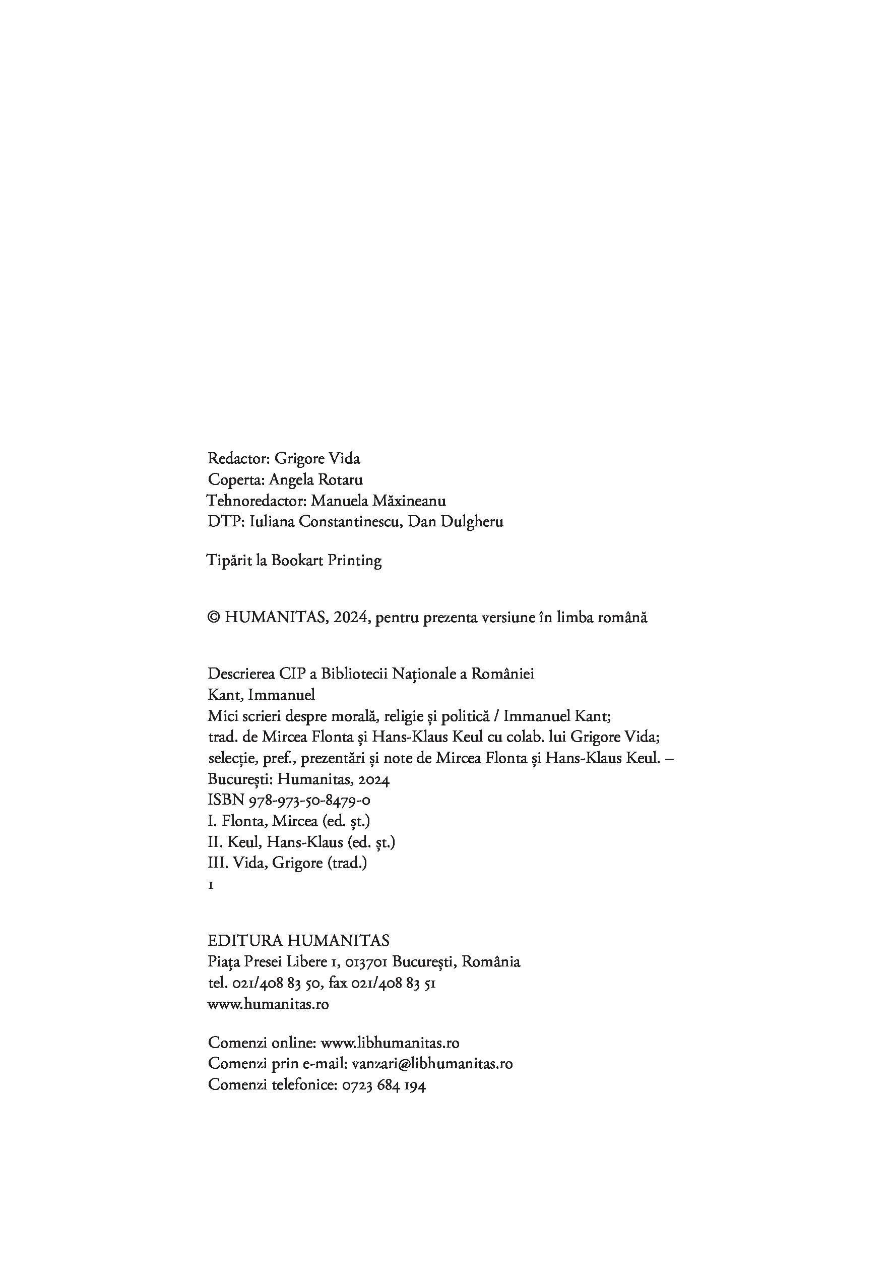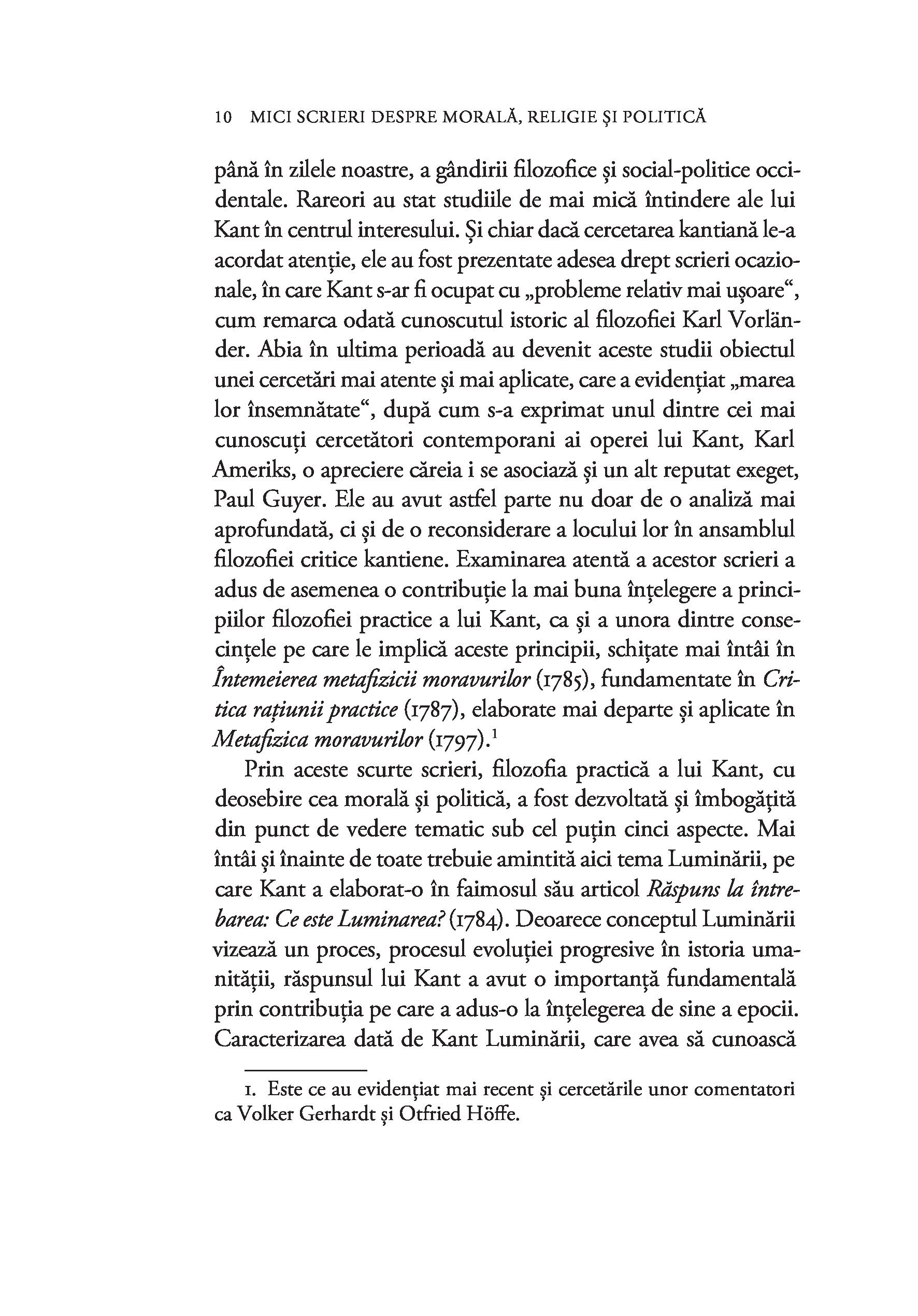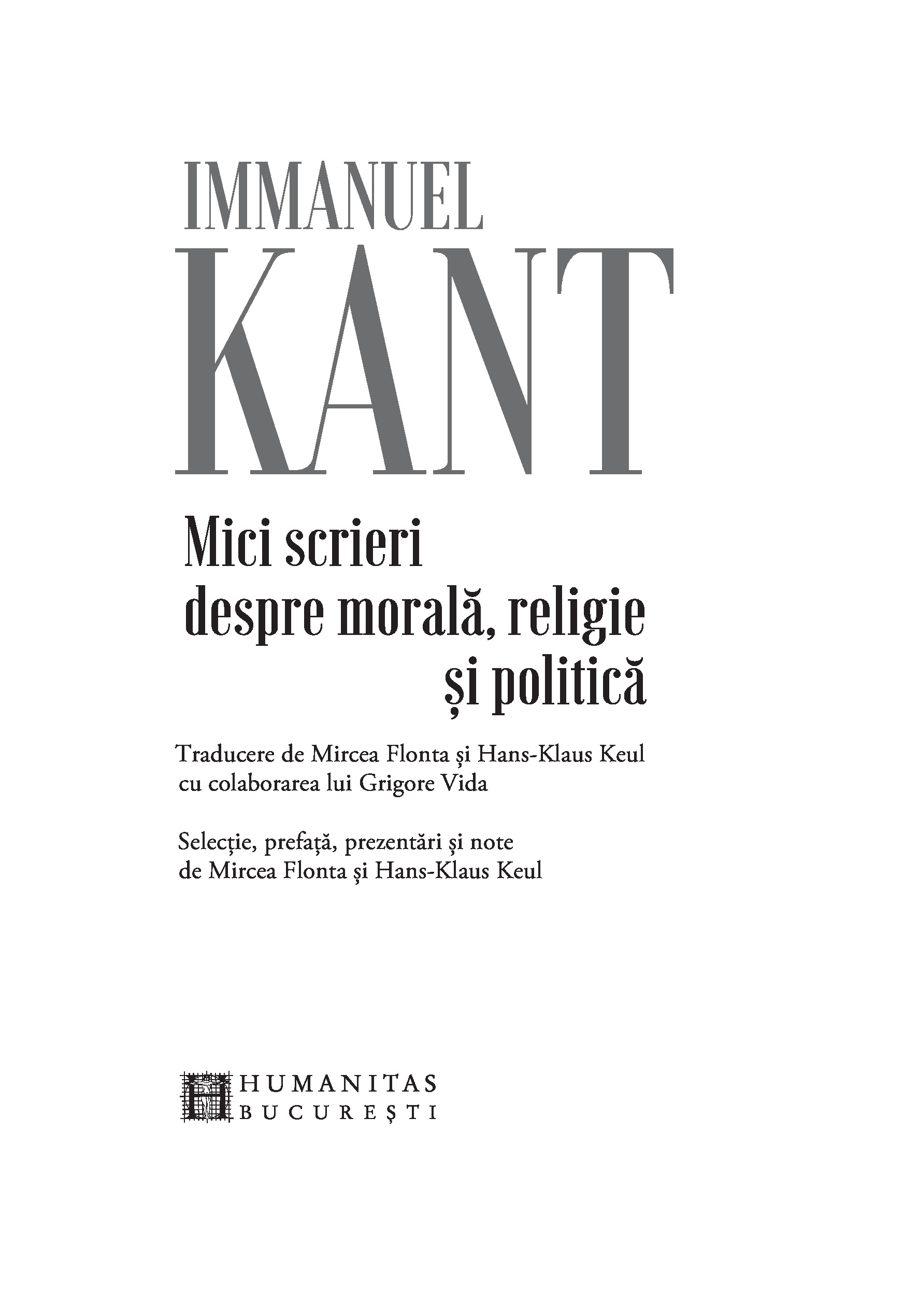 Volumul de față cuprinde câteva texte mai scurte și mai accesibile ale lui Immanuel Kant pe teme morale, religioase și politice.