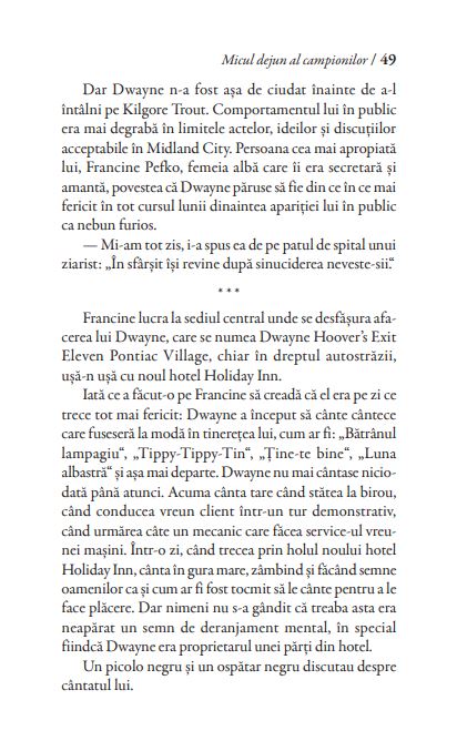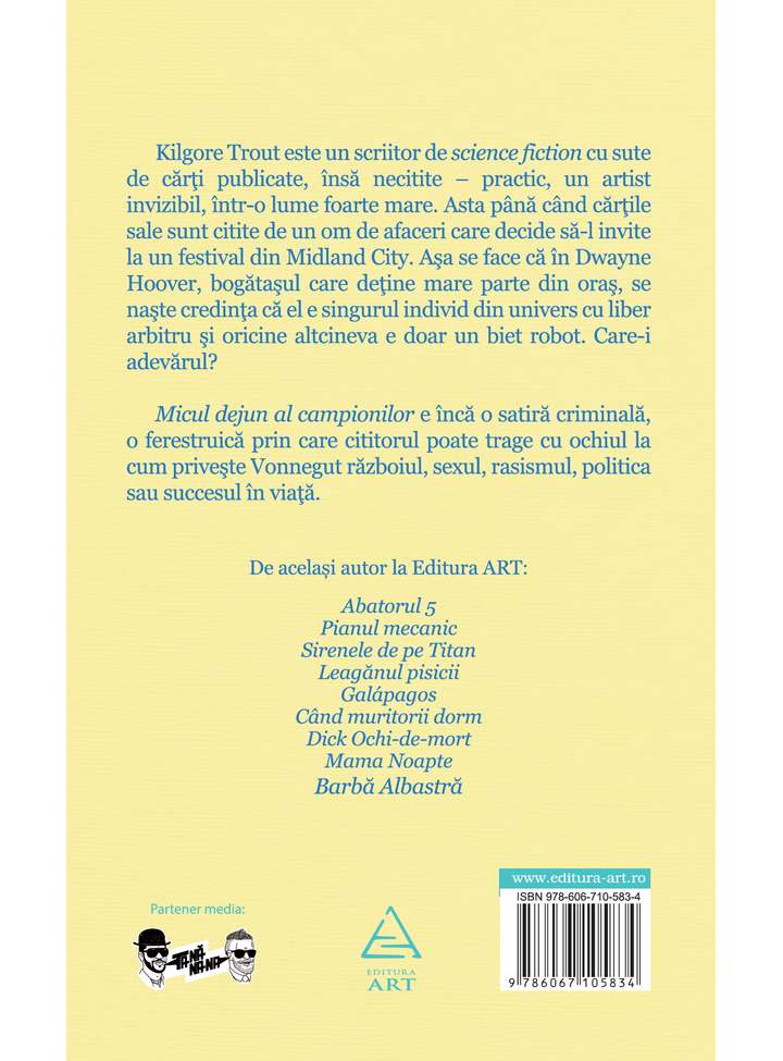 Micul dejun al campionilor e încă o satiră criminală, o ferestruică prin care cititorul poate trage cu ochiul la cum privește Vonnegut războiul, sexul, rasismul, politica sau succesul în viață.