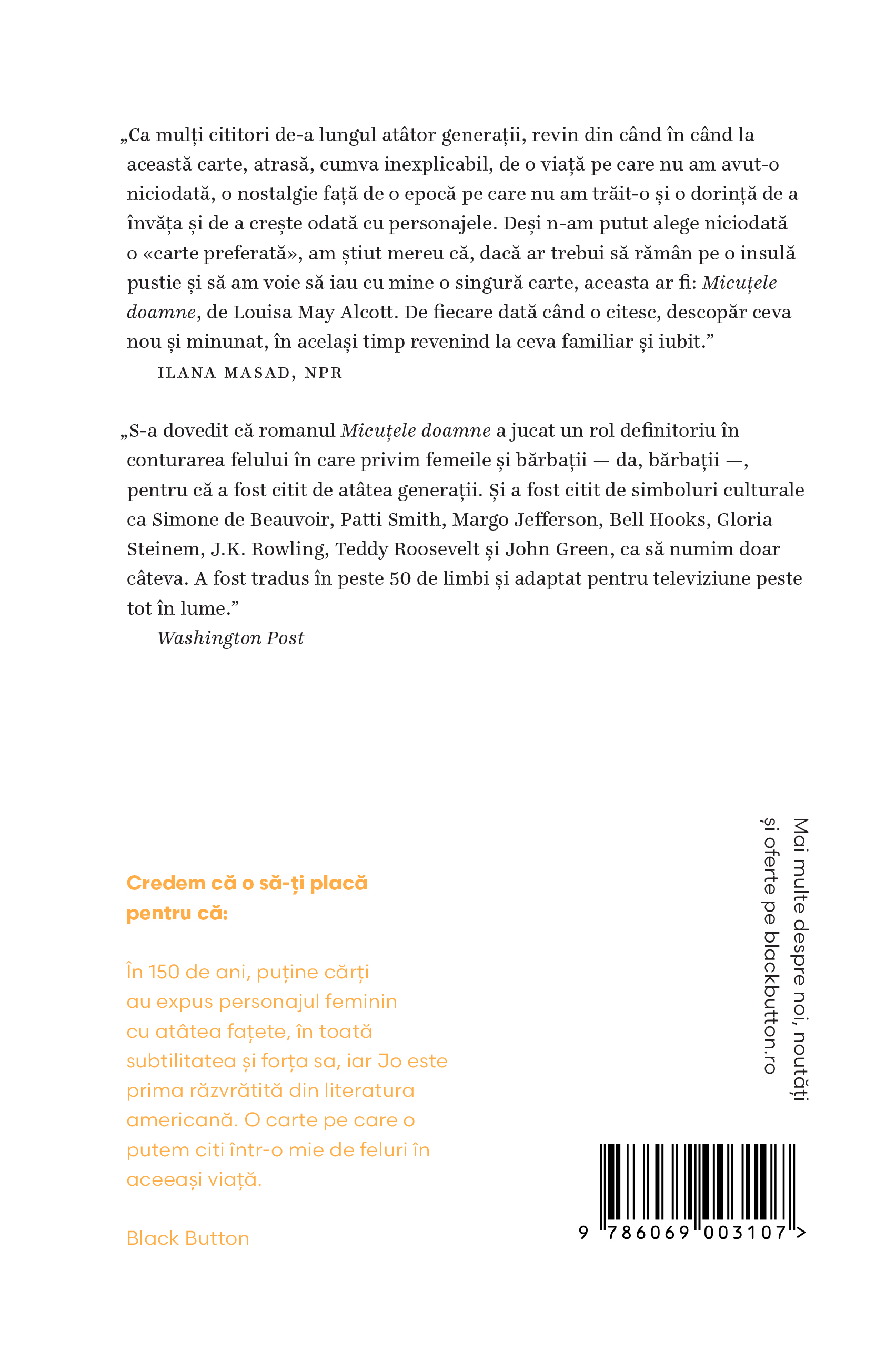 „Ca mulți cititori de-a lungul atâtor generații, revin din când în când la această carte, atrasă de un cumva inexplicabil dor de o viață pe care nu am avut-o niciodată, o nostalgie față de o epocă pe care nu am trăit-o și o dorință de a învăța și de a crește odată cu personajele. Deși n-am putut alege niciodată o «carte preferată», am știut mereu că, dacă ar trebui să rămân pe o insulă pustie și să am voie să iau cu mine o singură carte, aceasta ar fi: Micuțele doamne, de Louisa May Alcott. De fiecare dată când o citesc, descopăr ceva nou și minunat, în același timp revenind la ceva familiar și iubit.”