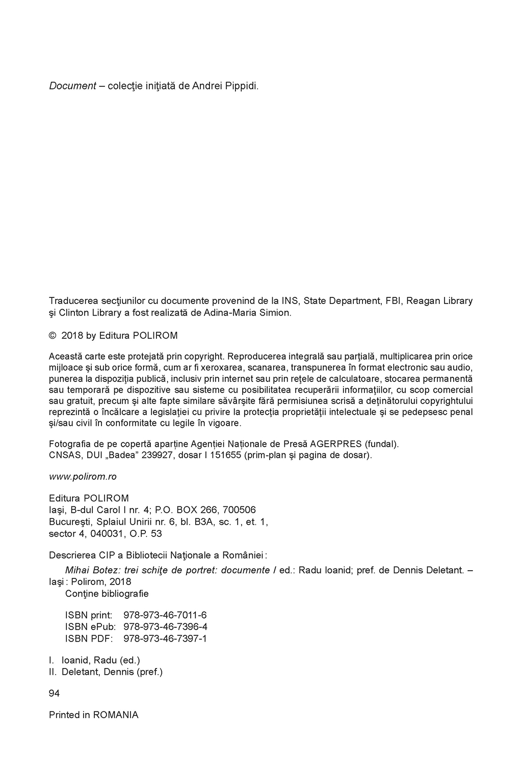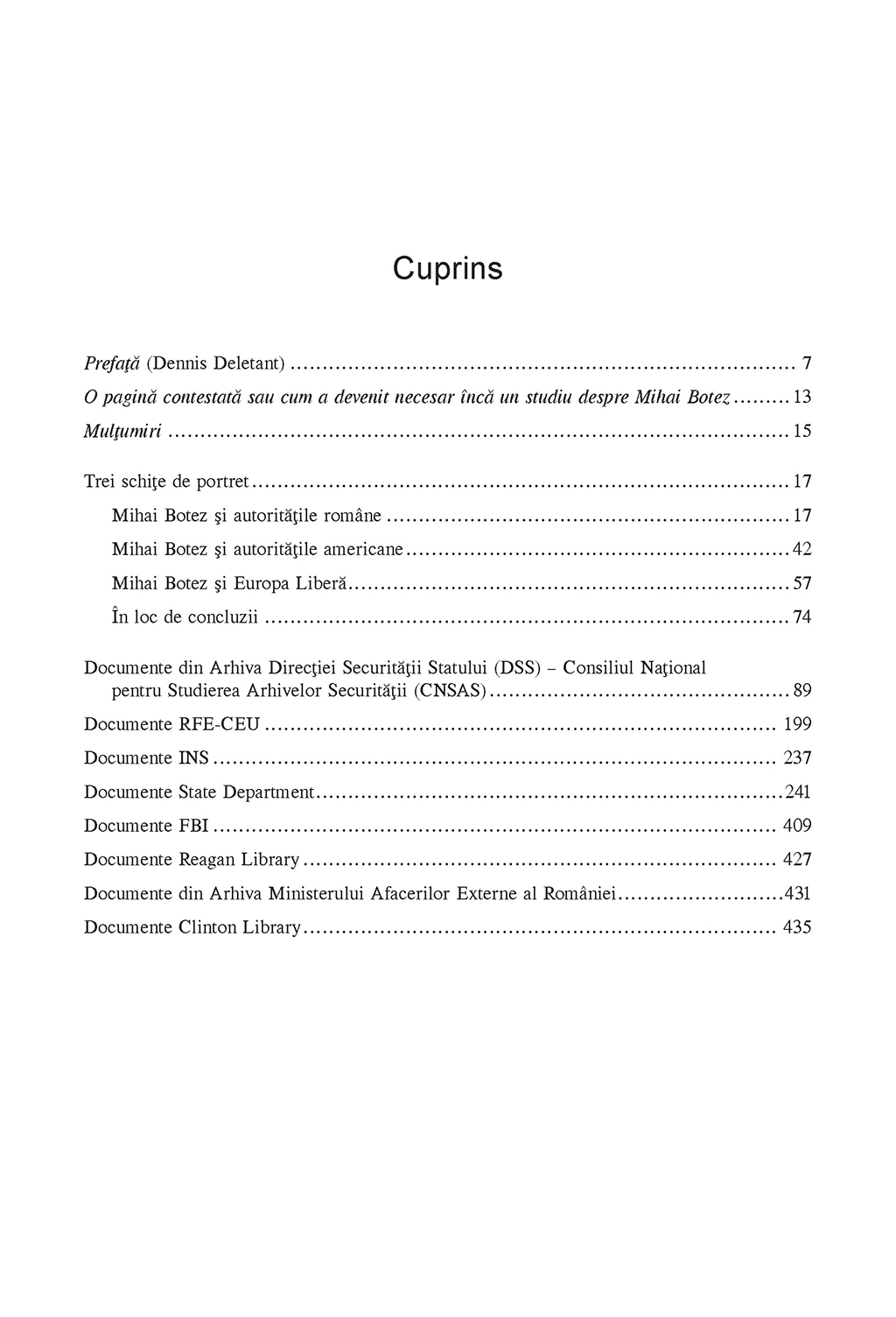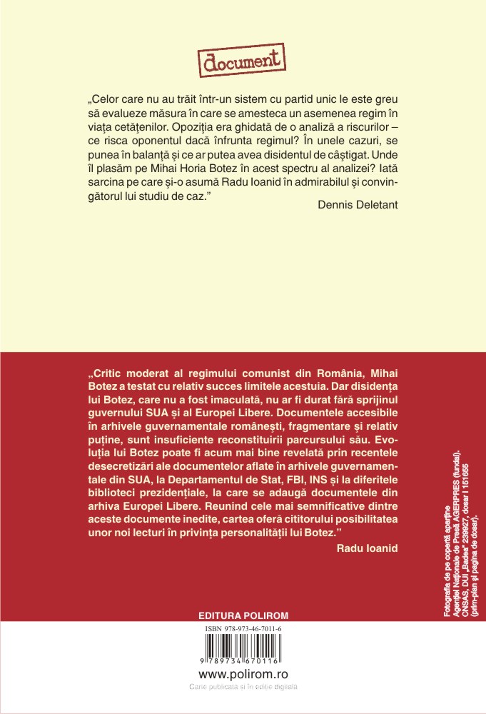 „Critic moderat al regimului comunist din România, Mihai Botez a testat cu relativ succes limitele acestuia. Dar disidenţa lui Botez, care nu a fost imaculată, nu ar fi durat fără sprijinul guvernului SUA şi al Europei Libere. Documentele accesibile în arhivele guvernamentale româneşti, fragmentare şi relativ puţine, sînt insuficiente reconstituirii parcursului său. Evoluţia lui Botez poate fi acum mai bine revelată prin recentele desecretizări ale documentelor aflate în arhivele guvernamentale din SUA, la Departamentul de Stat, FBI, INS şi la diferitele biblioteci prezidenţiale, la care se adaugă documentele din arhiva Europei Libere. Reunind cele mai semnificative dintre aceste documente inedite, cartea oferă cititorului posibilitatea unor noi lecturi în privinţa personalităţii lui Botez.” (Radu Ioanid)