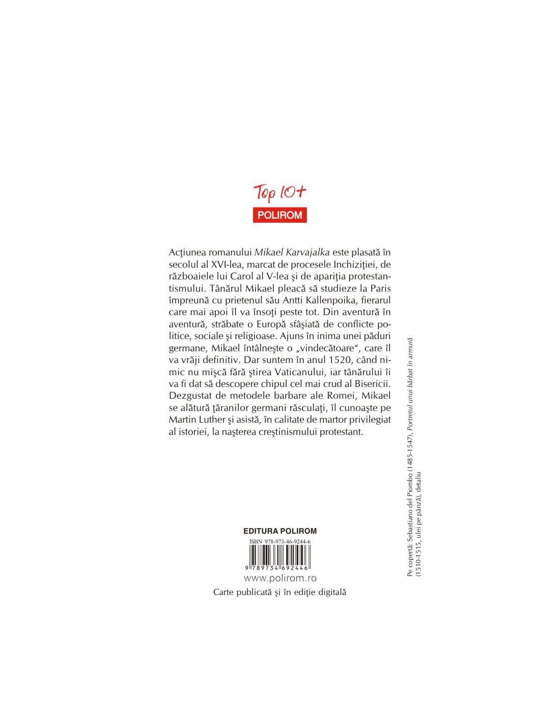 Acţiunea romanului Mikael Karvajalka este plasată în secolul al XVI‑lea, marcat de procesele Inchiziţiei, de războaiele lui Carol al V‑lea şi de apariţia protestantismului. Tânărul Mikael pleacă să studieze la Paris împreună cu prietenul său Antti Kallenpoika, fierarul care mai apoi îl va însoţi peste tot. Din aventură în aventură, străbate o Europă sfâşiată de conflicte politice, sociale şi religioase. Ajuns în inima unei păduri germane, Mikael întâlneşte o „vindecătoare”, care îl va vrăji definitiv. Dar suntem în anul 1520, când nimic nu mişcă fără ştirea Vaticanului, iar tânărului îi va fi dat să descopere chipul cel mai crud al Bisericii. Dezgustat de metodele barbare ale Romei, Mikael se alătură ţăranilor germani răsculaţi, îl cunoaşte pe Martin Luther şi asistă, în calitate de martor privilegiat al istoriei, la naşterea creştinismului protestant.