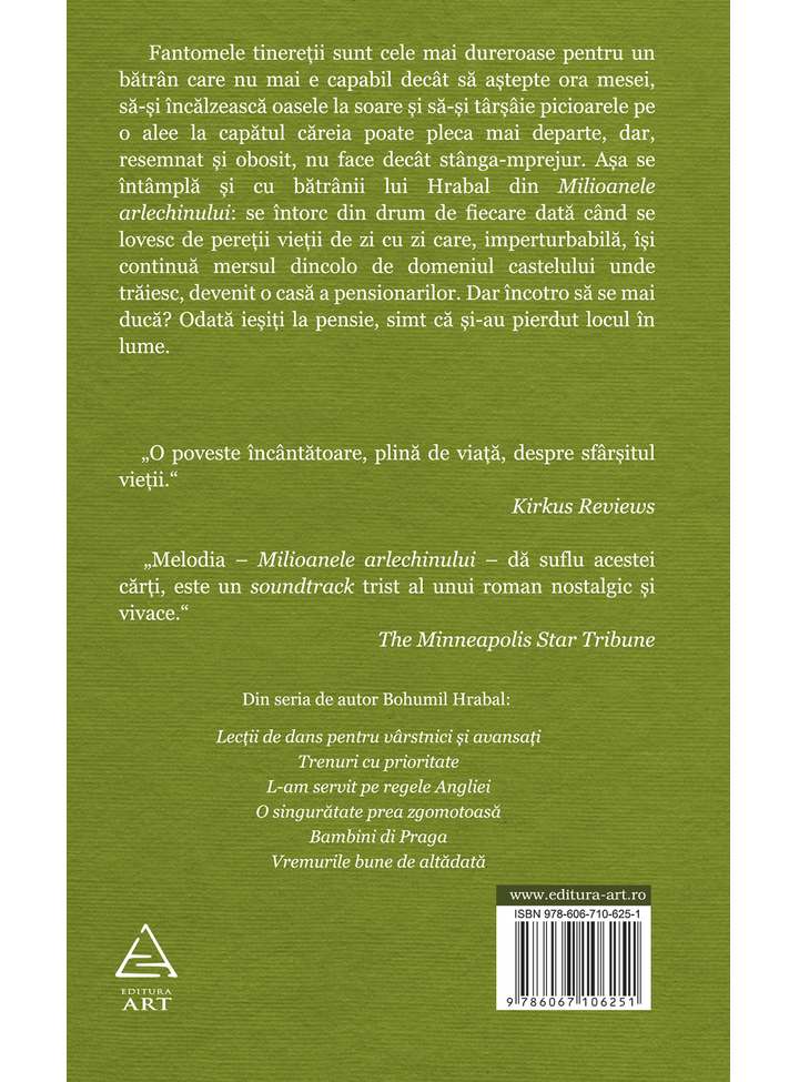 Fantomele tinereții sunt cele mai dureroase pentru un bătrân, care nu mai e capabil decât să aștepte ora mesei, să-și încălzească oasele la soare și să-și târșâie picioarele pe o alee la capătul căreia poate pleca mai departe, dar, resemnat și obosit, nu face decât stânga-mprejur. Așa se întâmplă și cu bătrânii lui Hrabal din Milioanele arlechinului, se întorc din drum de fiecare dată când se lovesc de pereții vieții de zi cu zi care, imperturbabilă, merge mai departe dincolo de domeniul castelului unde trăiesc, devenit o casă a pensionarilor. Dar încotro să se mai ducă? Odată ieșiți la pensie, simt că și-au pierdut locul în lume.